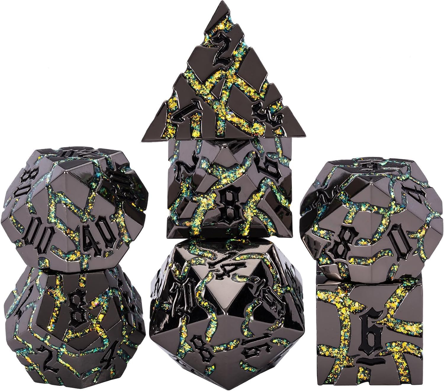 7PCS DND Dice Set,Metalli Crack Stripe Dice Set with Gift BOC,Dungeons and Dragons Polyhedral Metal Dice for RPG Board Games (Black Nickel Yellow)