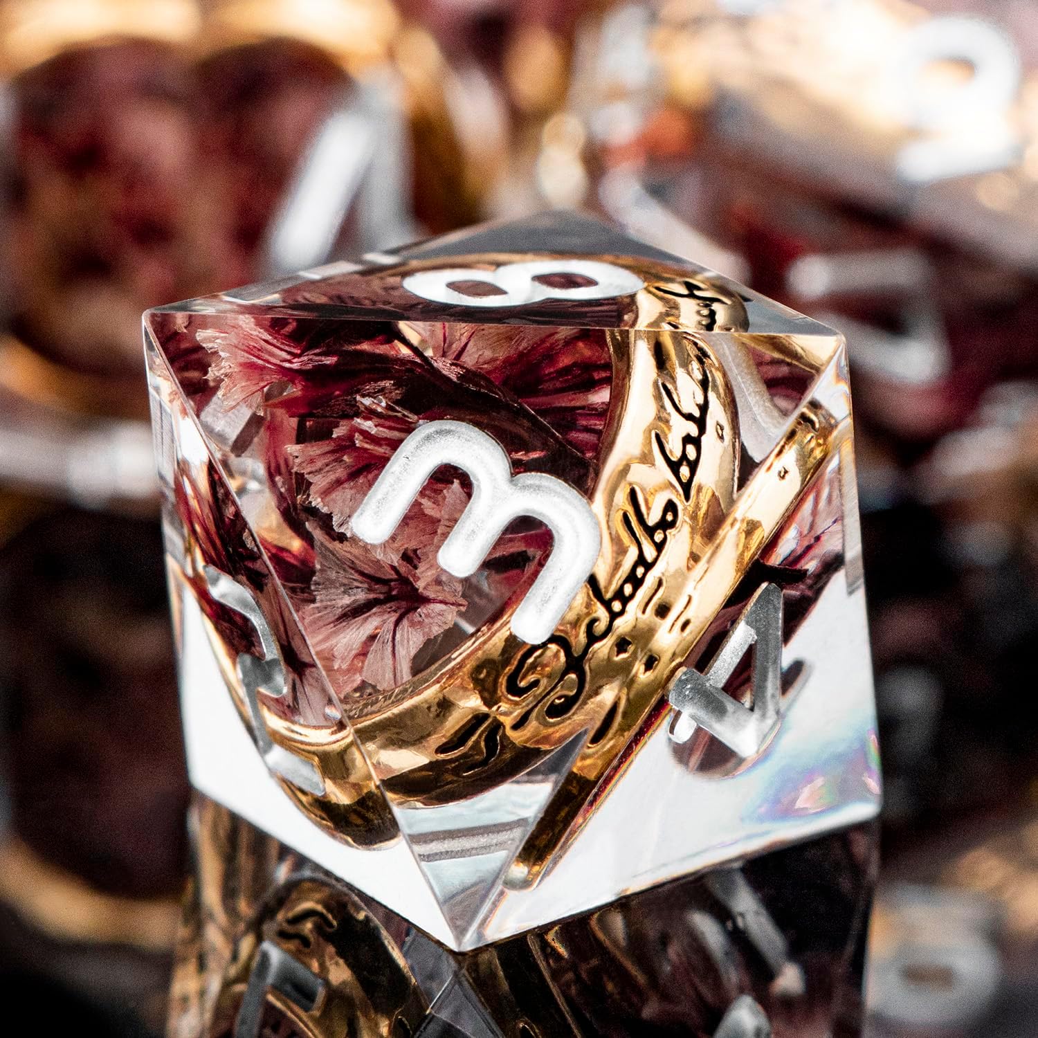 Magic Golden Ring DND Dice Set Sharp Edge Resin Dice with Case, Pink Flower Lord D and D Dice for use with D&D RPG Role Playing Games, Polyhedral Dice Set D20 D12 D10 D8 D6
