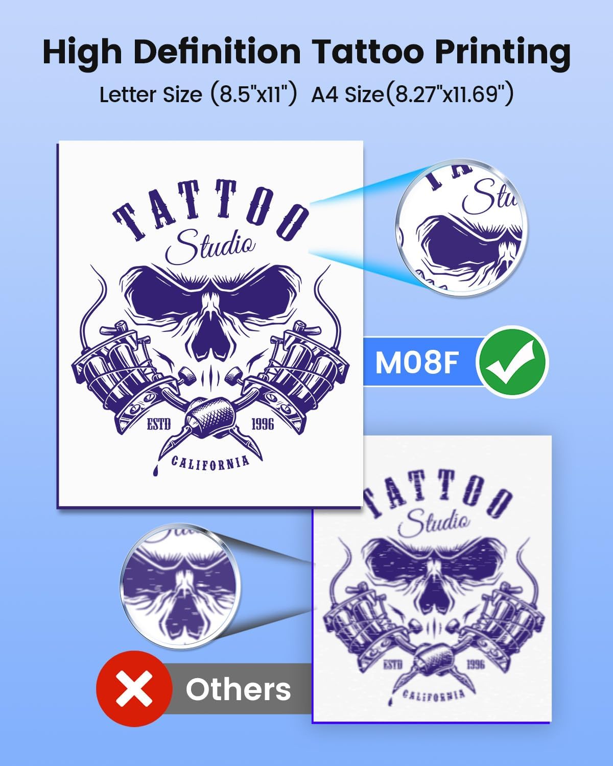- Phomemo M08F Multi-function Printer - Not only a portable printer but also the latest tattoo stencil printer. The Phomemo tattoo stencil printer features a lightweight and wireless design, weighing just 2 pounds, which is only 60% of the size of traditional tattoo transfer machines. With its built-in rechargeable battery, you don't have to worry about being bound by charging cables, providing unparalleled convenience and ease-of-use for on-the-go professionals and tattoo artists