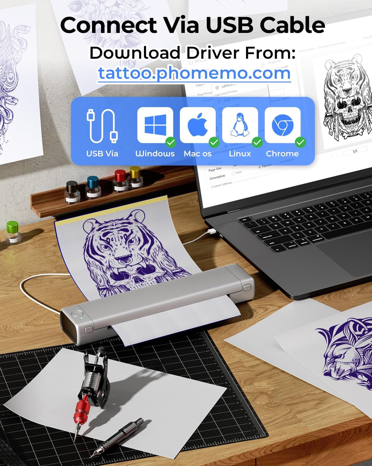 - Powerful Phomemo App - Say goodbye to complicated printing processes - our Phomemo App allows for one-click printing of images and documents. Unlike traditional tattoo printer machine that require printing on white paper before copying, you can print your designs instantly with our app. Plus, for optimal printing results, we recommend using Phomemo Tattoo Transfer Paper.Alternatively, connect to your PC/Laptop via USB cable and print directly. (PC/Laptop printing download the driver: m08f.phomemo.com)