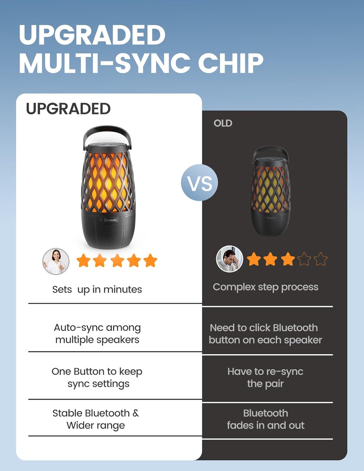 - Astonishing Surround Sound - Bluetooth 5.0 and its built-in DSP technology ensure a well-balanced sound experience with great clarity. Need more vibes and space-filling sound for parties or outdoor events? You can pair up to 100 flickering flame Bluetooth speakers together and synchronize music playback across them to get a more immersive and 360° surround sound experience