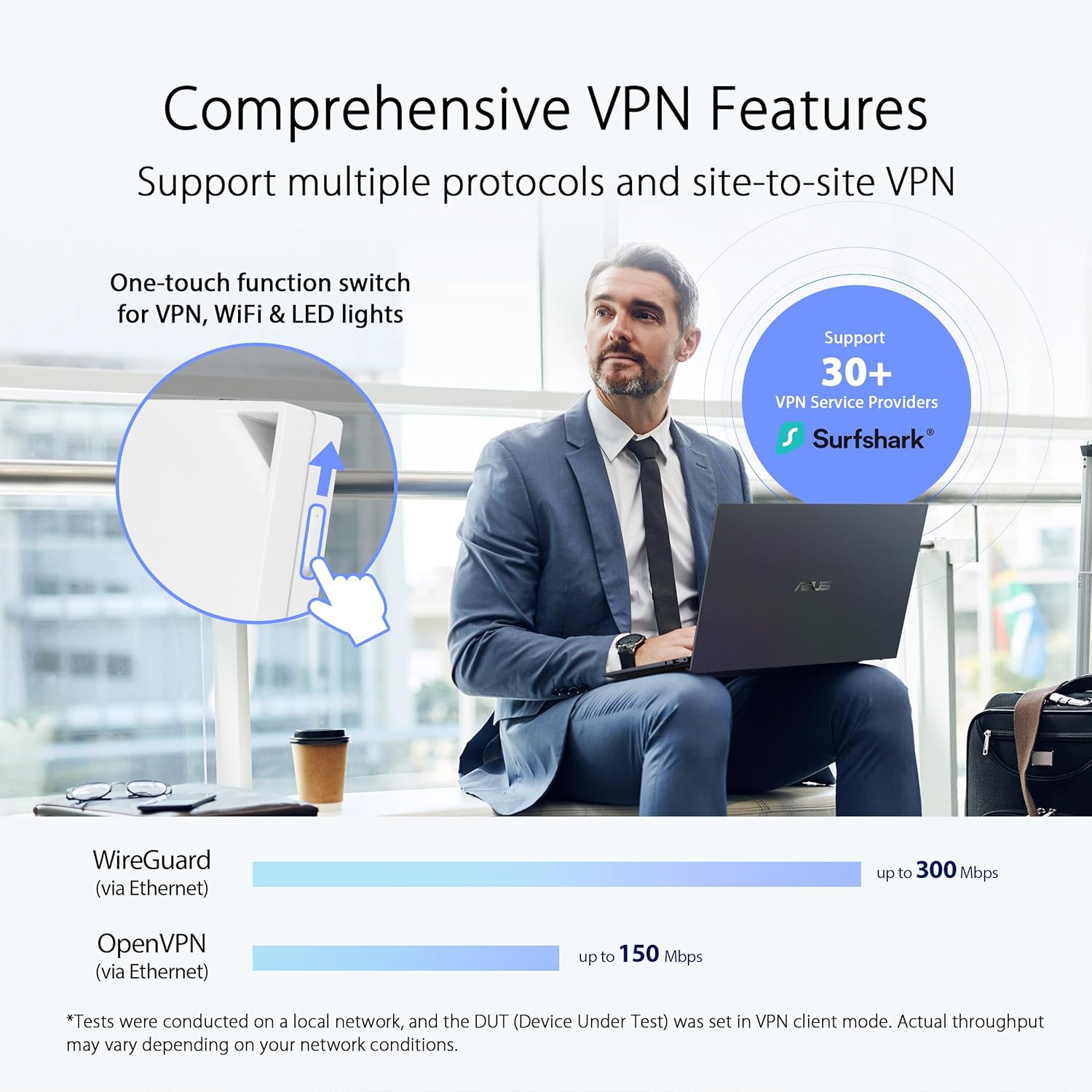 - Comprehensive VPN features with one-touch activation, supporting multiple protocols, up to 30 service providers, and site-to-site VPN.