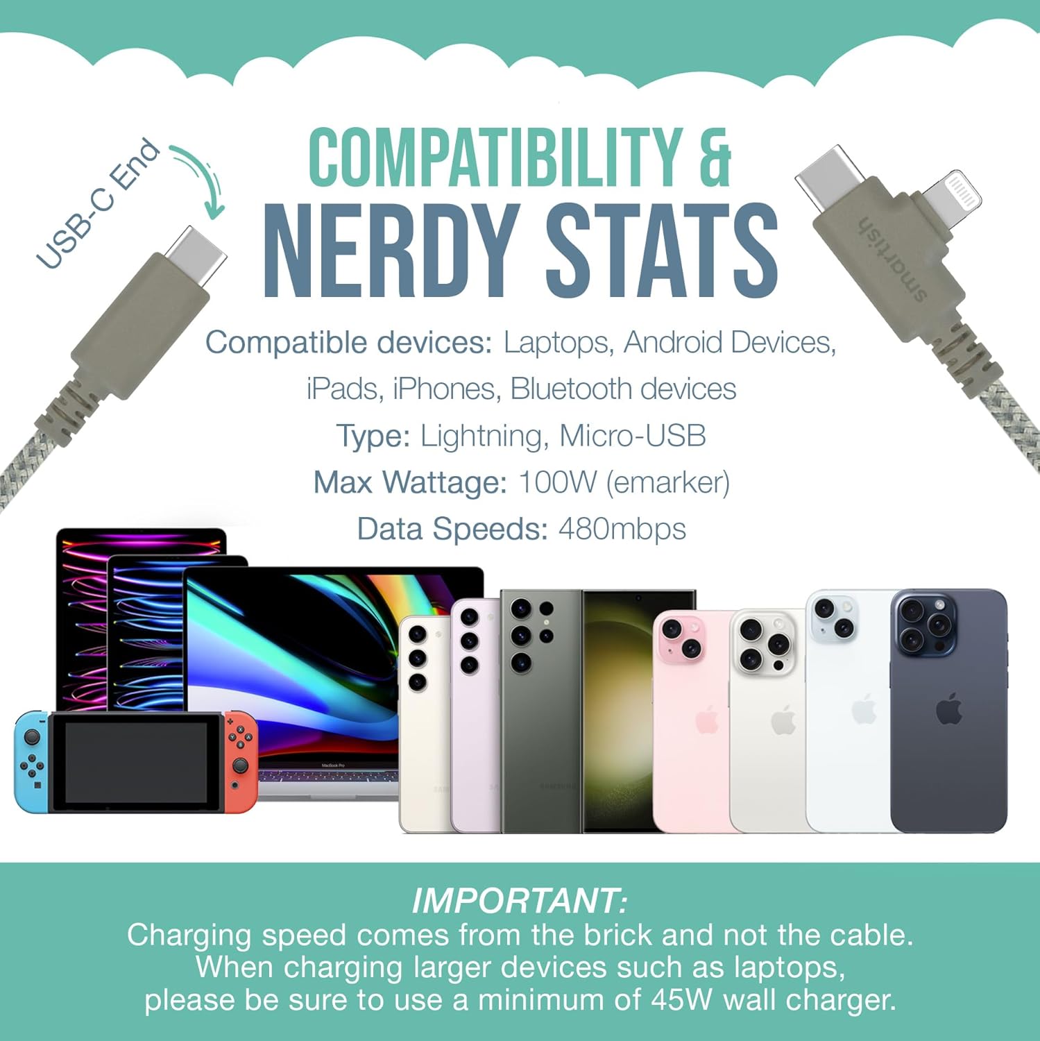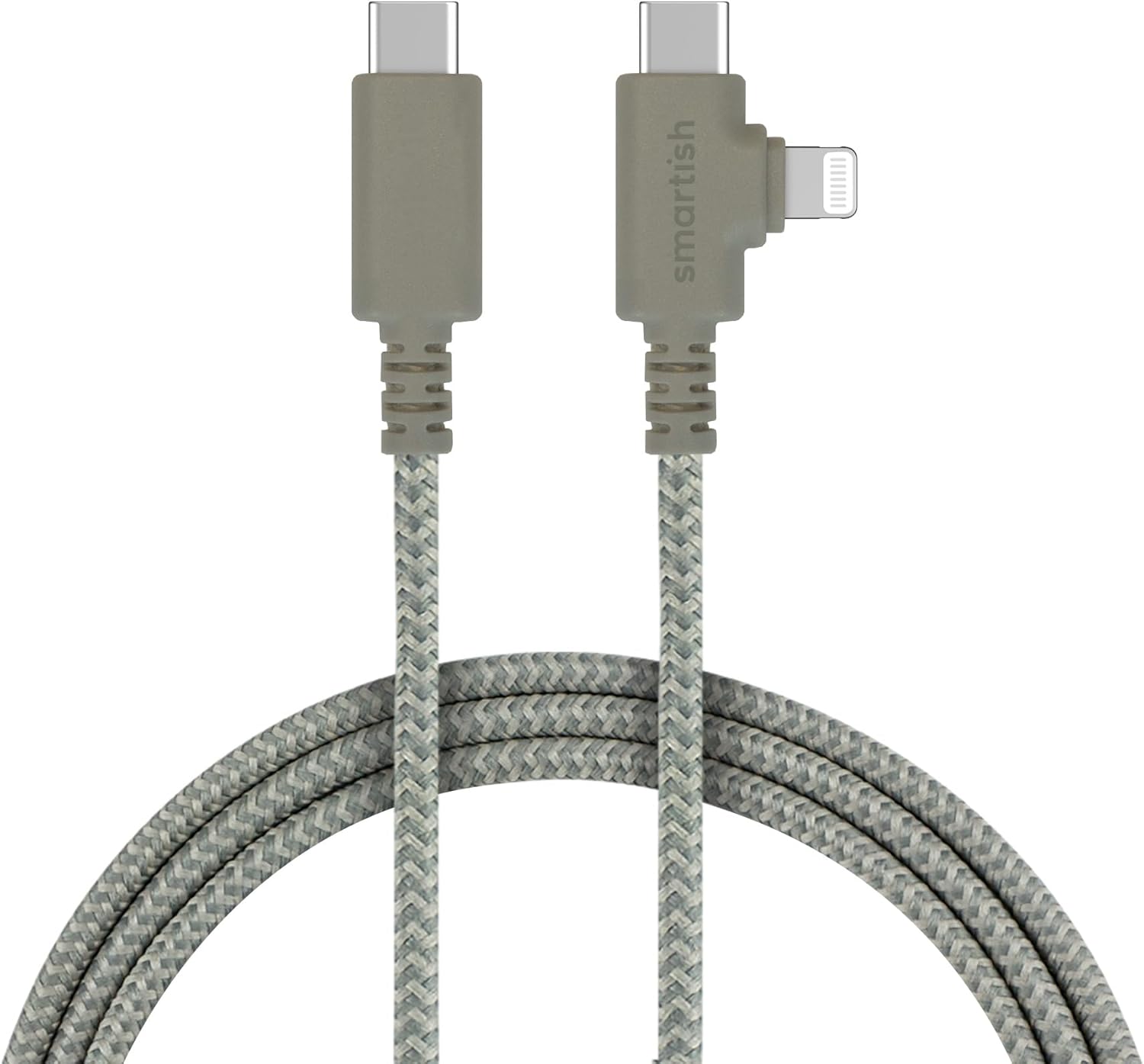 Smartish 2 in 1 USB C to USB C/Lightning Cable - Crown Joule - 6 Ft Fabric Wrapped Fast Charging Cord - for iPhone, Galaxy, Pixel - 100W Dual Fast Charger for Phones/Laptops - Lightly Toasted Beige