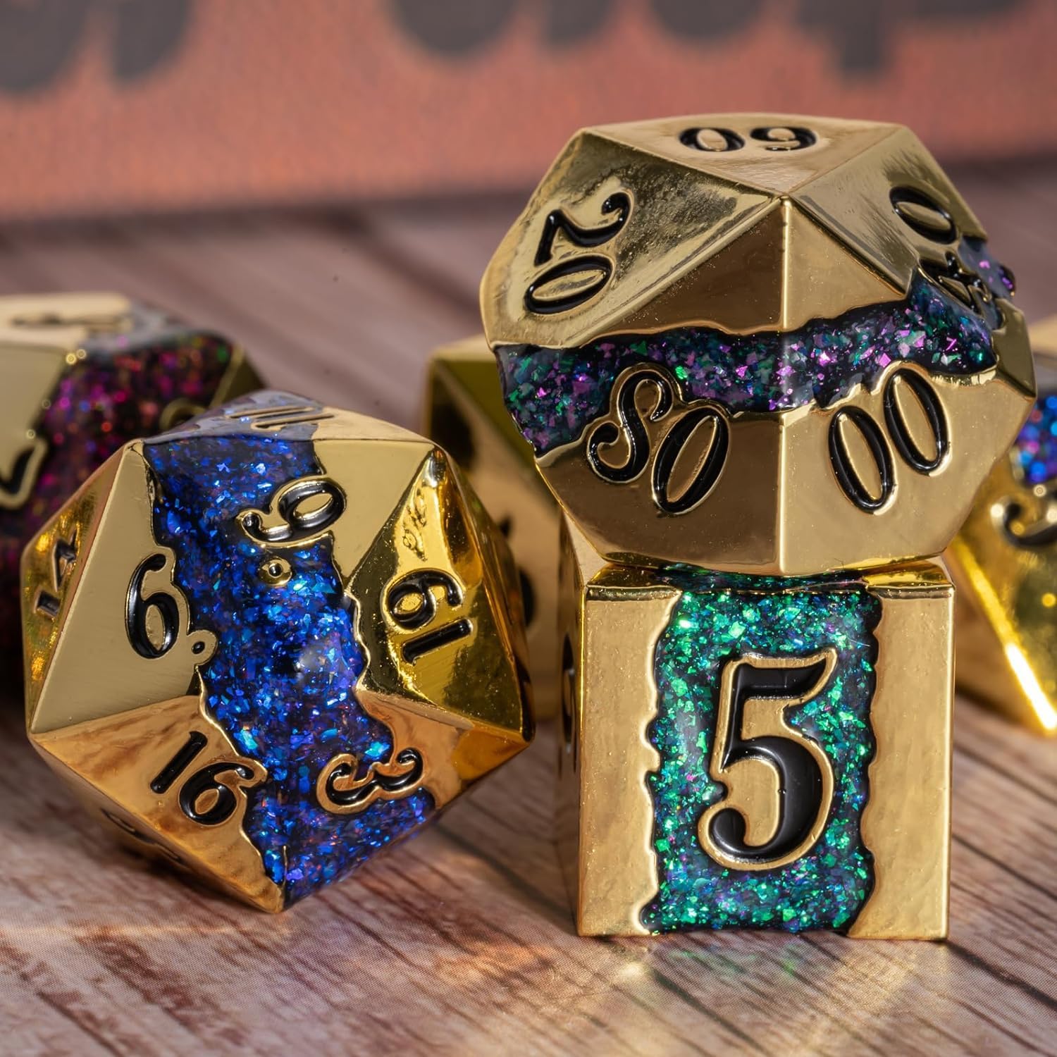 Metal DND Dice Set,Mica Glitter Stripe Dice Set with Gift Box,Metallic 7pcs Polyhedral Dice Set for RPG