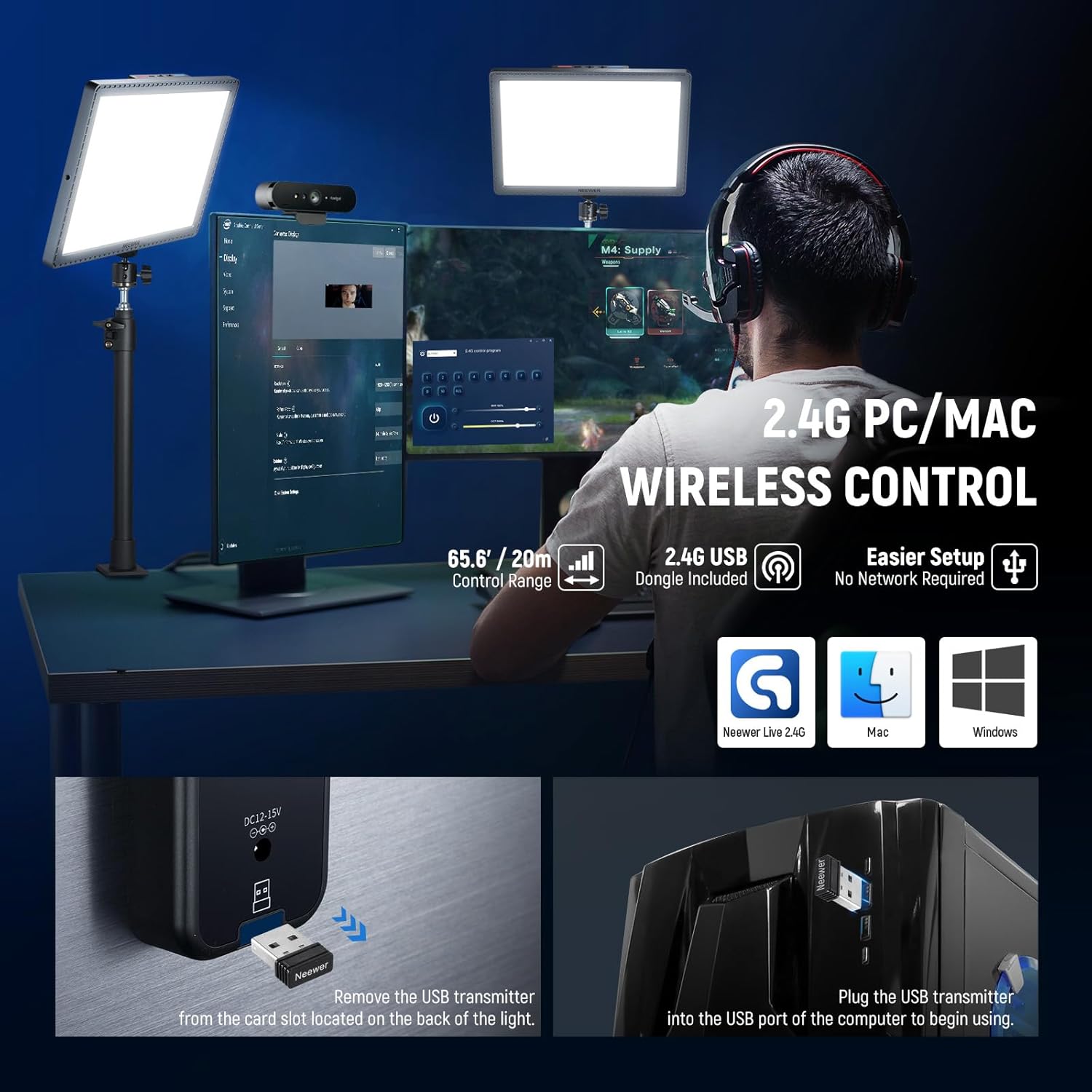 - 【Upgraded to 3 Ways App Connections】 Way 1.【No Wifi Connect Needed 】Plug the 2.4G USB dongle into your PC/Mac and download the "NEEWER Live 2.4G" App to enable remote control. Way 2.【Wifi Connection 】Requires to download the latest version (Windows V1.2.0 & macOS V1.4.0) of the "NEEWER Live" App on PC/Mac or pairing with Stream Deck (Only compatible with Elgato). Way 3.【Bluetooth Connection】 With the built in Bluetooth module, you can use your phone to control the lights via the " NEEWER " App.