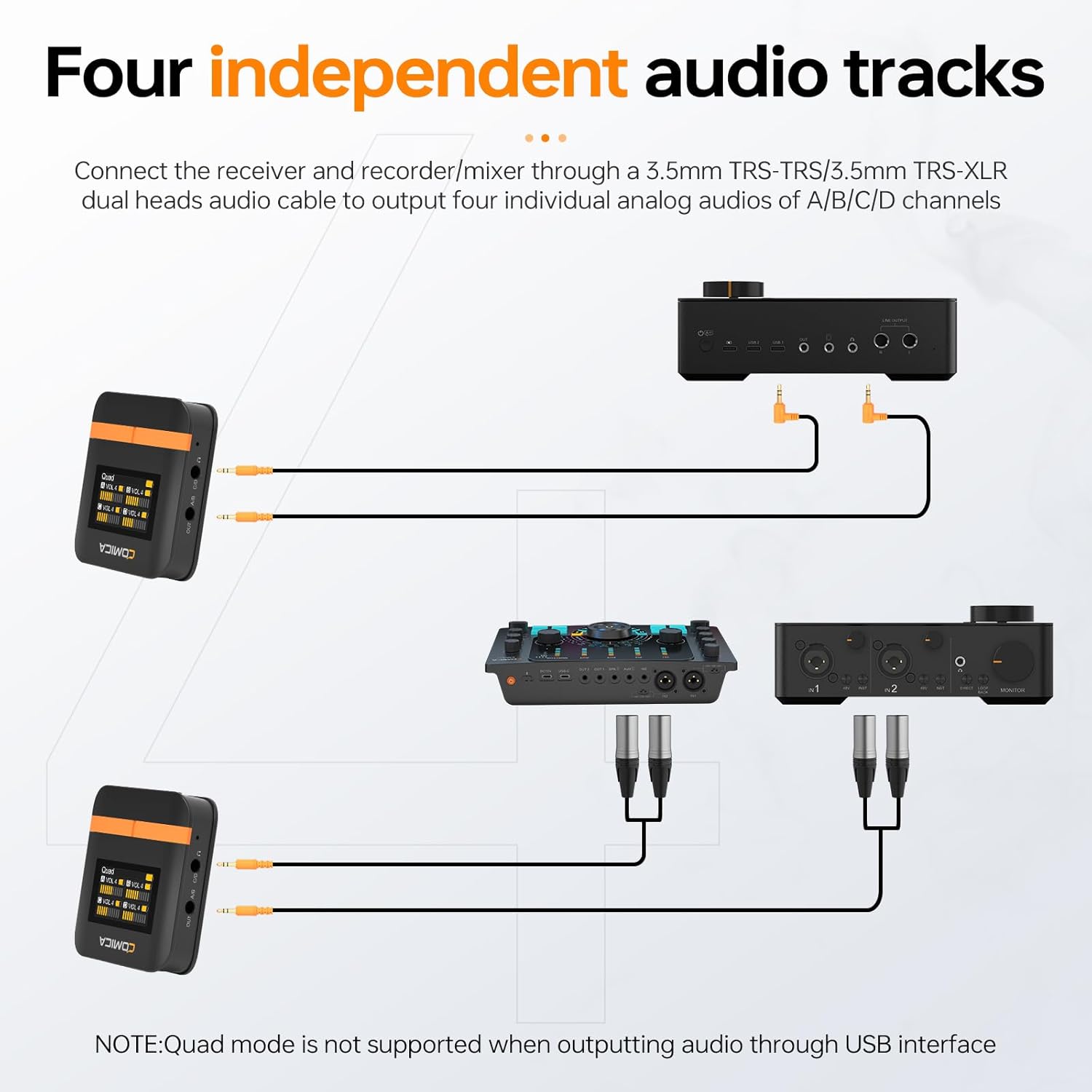 - 4-Transmitter Wireless System: Vimo Q supports Mono/Stereo/Quad 3 audio output modes. In Mono/Stereo mode, audio signals can be output as mixing audio track. In Quad mode, each audio signal can be output as an individual audio track and edited independently during post-processing to meet users' needs for high-quality audio production.Ideal for group recordings, presentations, conferences, interviews, and dynamic video shoots.