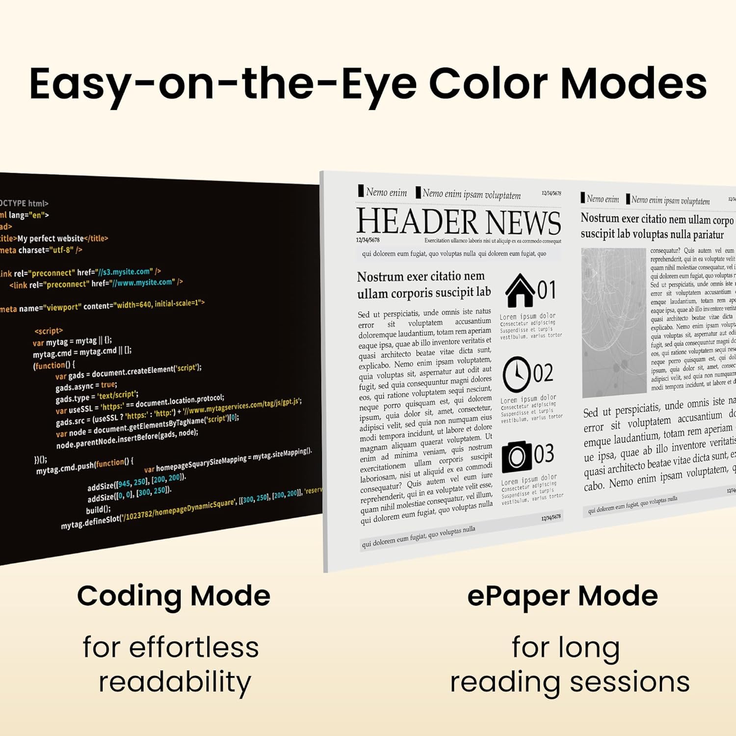 - 【Easy on the Eye Color Modes】Choose Mode for a more comfortable viewing experience. Coding Mode enhances readability for long coding sessions, while ePaper Mode reduces eye strain for extended reading periods