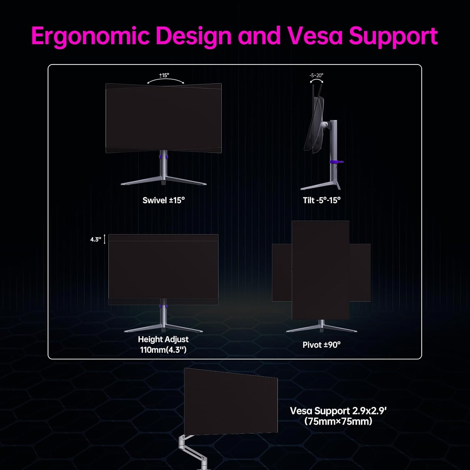 - [Endless Features]Explore KVM support, VESA 2.9x2.9''(75mm×75mm) compatibility, and 2×5W built-in speakers. Flicker Free and Low Blue Light enhance your cinematic experience, taking entertainment to new heights.