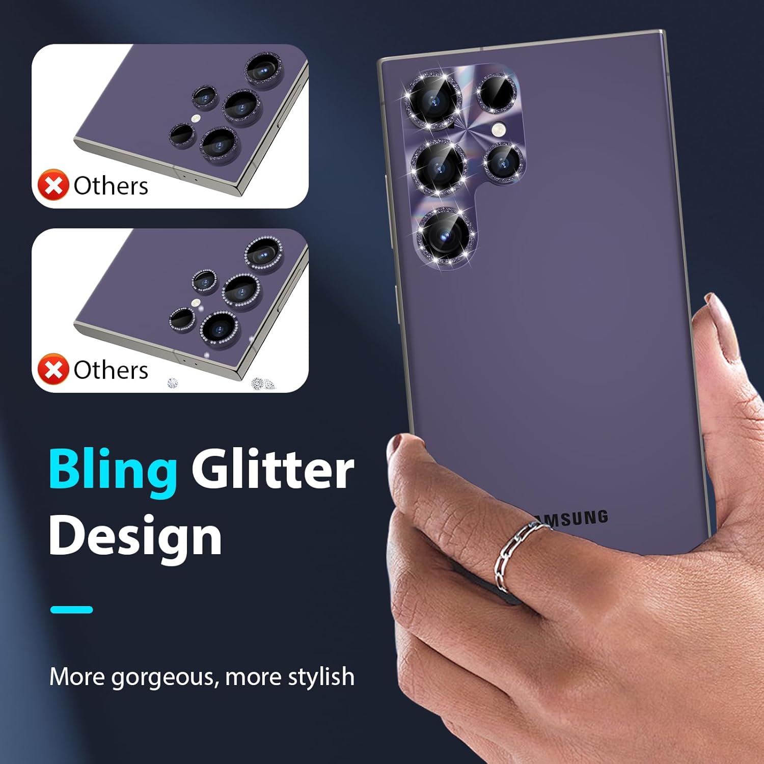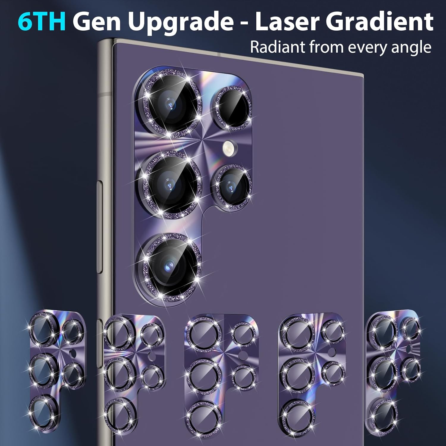 - 1:1-Match Your Style: Made of premium titanium alloy ring and polycarbonate plate, this Galaxy S24 Ultra camera lens protector is precisely cut 1:1 to perfectly fit the original lens area structure of S24 Ultra. The high profile laser gradient with delicate glitter design, full of punk, cool and charming, just like the persistence of personality freedom and life attitude.