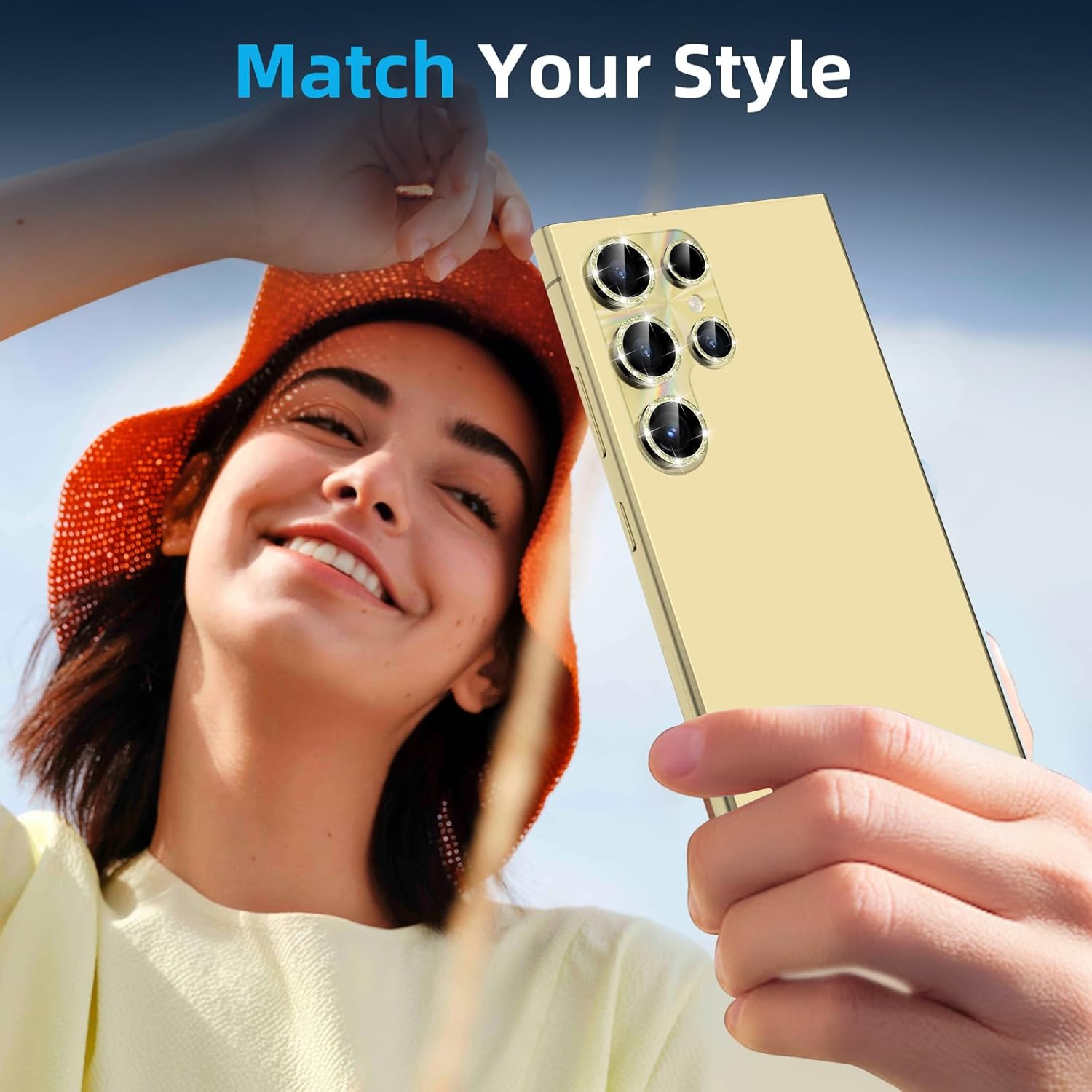 - 1:1-Match Your Style: Made of premium titanium alloy ring and polycarbonate plate, this Galaxy S24 Ultra camera lens protector is precisely cut 1:1 to perfectly fit the original lens area structure of S24 Ultra. The high profile laser gradient with delicate glitter design, full of punk, cool and charming, just like the persistence of personality freedom and life attitude.