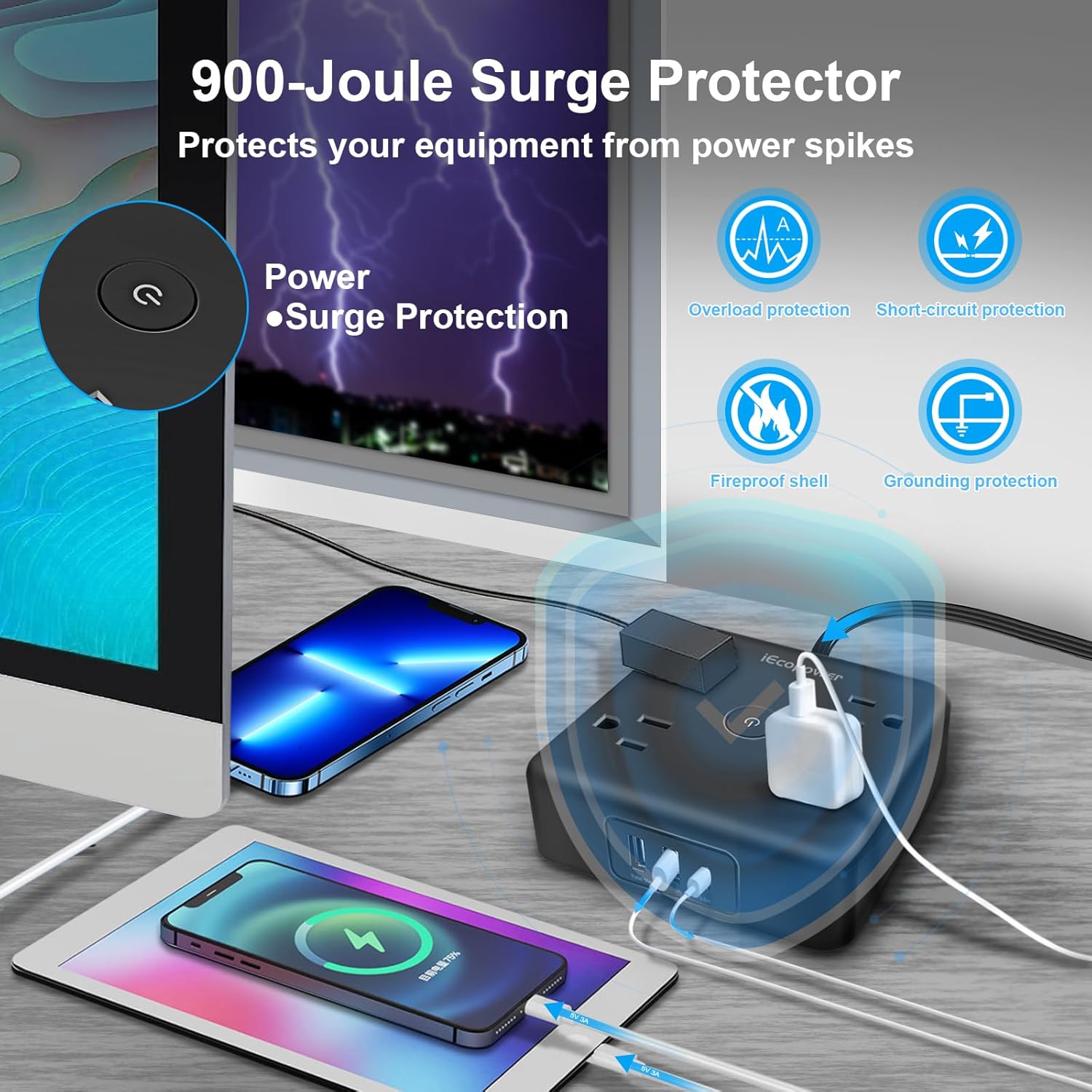 - 【Safety 15 ft power strip】 -ETL safety certified, made of fireproof ABS+PC (Grade: UL-V0, the highest fire rating), can withstand high temperatures up to 1382℉, high-end solid state capacitors to ensure complete protection of your device from electrical short circuits, overheating, overcharging, overcurrent and overvoltage, so it will not heat up during use and keep your device safe.