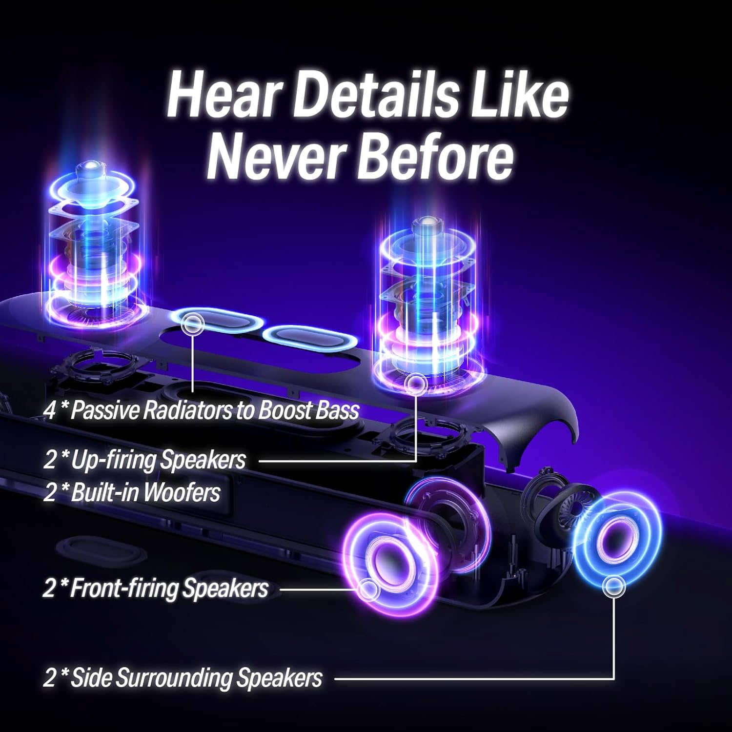 - [Hear Every Detail] - Engineered with four full-range drivers evenly distributed at the front and sides, the soundbar produces a wide sound spectrum. It incorporates two silk membrane tweeters to minimize distortion and deliver clearer treble. Additionally, two powerful built-in woofers, along with four passive radiators in an optimized vertical layout, enrich low-end sounds for a fuller bass experience.