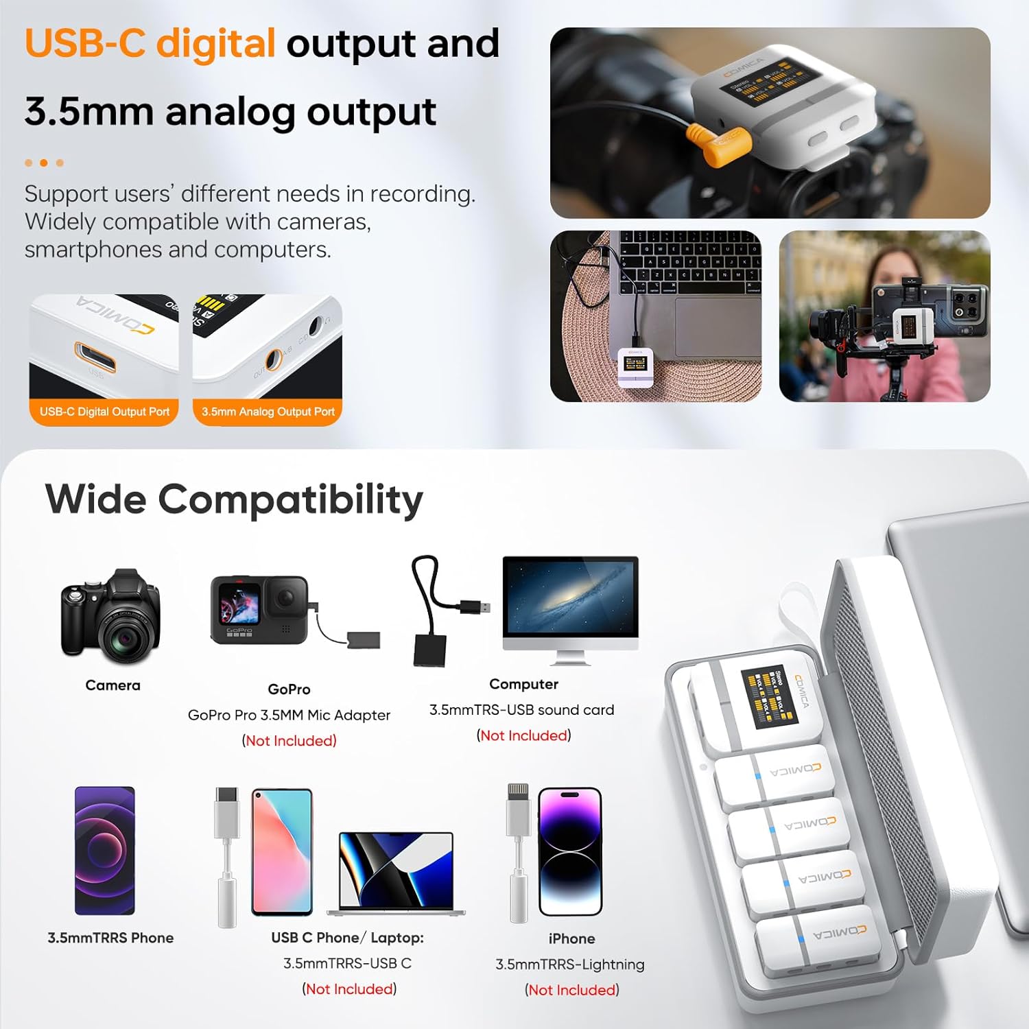 - Universal Compatibility with Effortless Switching: Seamlessly toggle between USB-C digital and 3.5mm analog outputs to meet diverse recording requirements. The Comica Vimo Q wireless microphone system effortlessly adapts to cameras, smartphones, and computers, ensuring hassle-free and universal compatibility for all your recording needs.