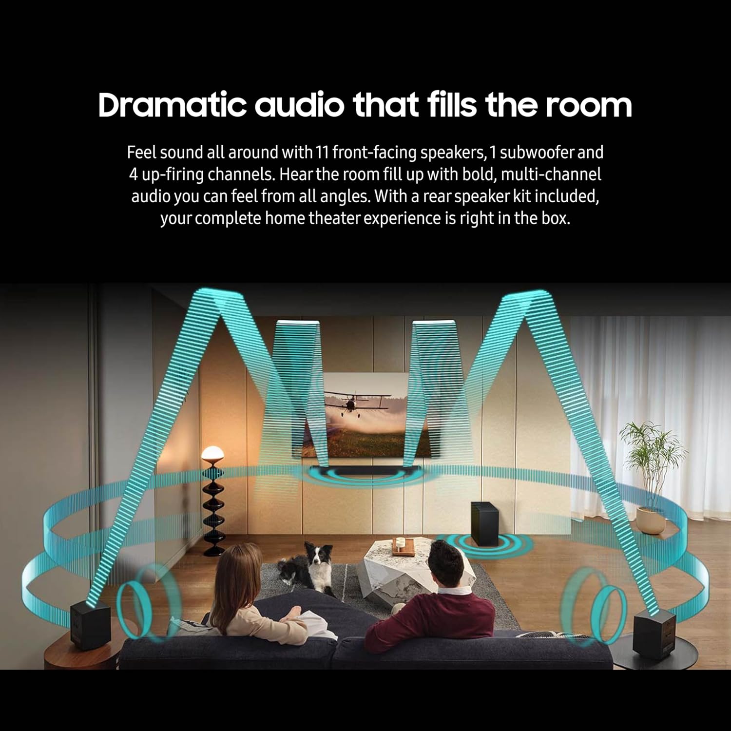 - 11.1.4 CH. TRUE DOLBY ATMOS SOUND: Feel sound all around with 11 front-facing speakers, 1 subwoofer & 4 up-firing channels; With a rear speaker kit included, your complete home theater experience is right in the box
