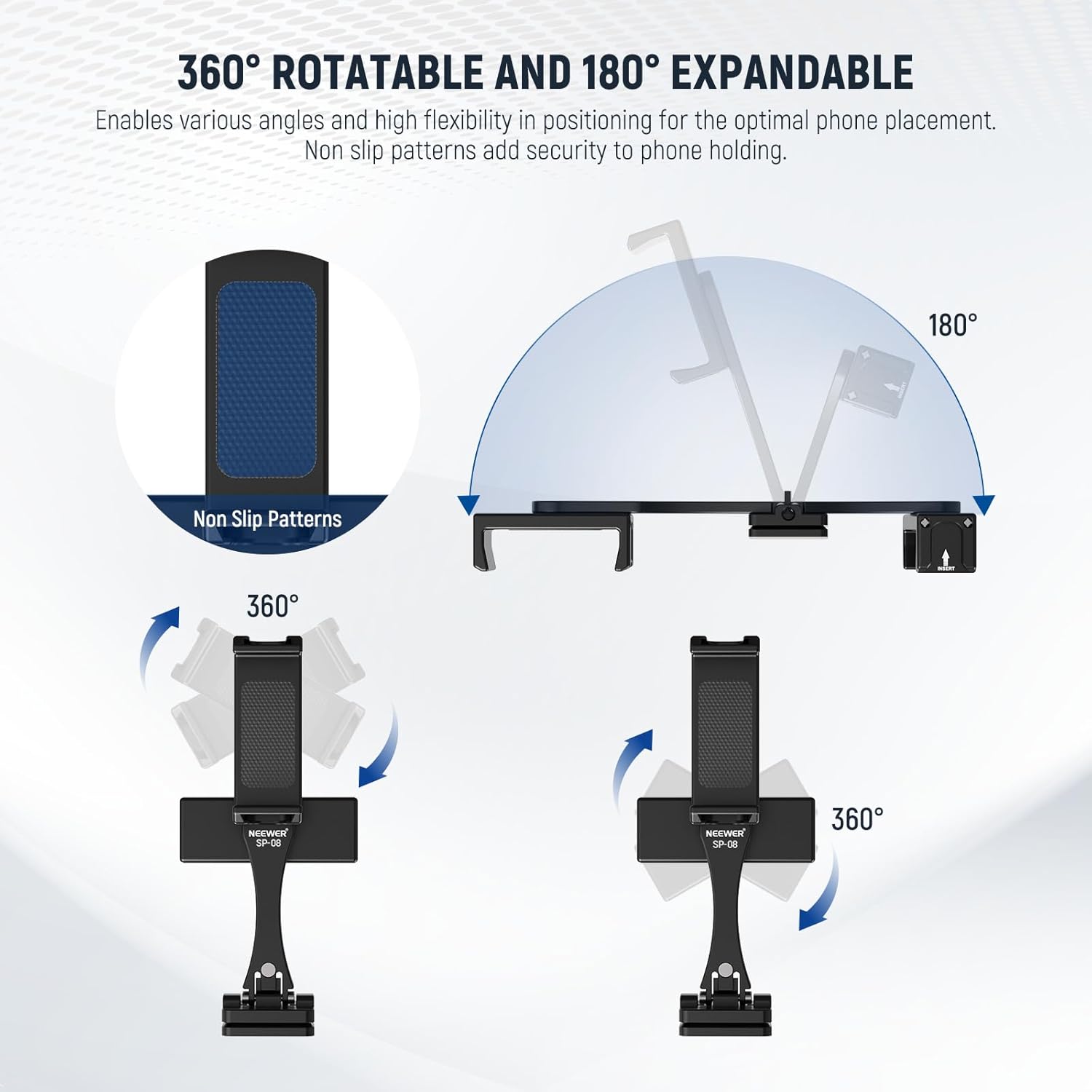 - 【360° Rotatable and 180° Expandable】 The phone clamps are 360° rotatable and 180° expandable for versatile angles and flexibility in positioning, enabling you to choose the optimal phone placement you need. Nonslip designs on the clamps add security to phone holding