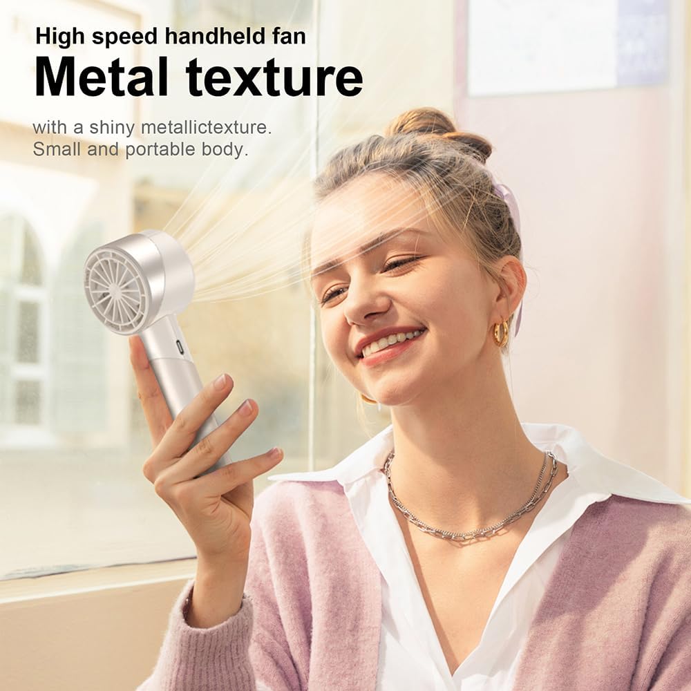 - Turbo Cooling Power, Instant Relief - Equipped with a 3W high-speed brushless motor (7000 RPM), this handheld fan delivers 5.8 m/s ultra-strong wind through a turbocharged airflow channel. 40% more powerful and 30% quieter than traditional mini portable fans, it solves weak airflow and noise issues—ideal for outdoor adventures, commutes, or makeup touch-ups. Perfect as a personal fan for instant cooling anywhere.