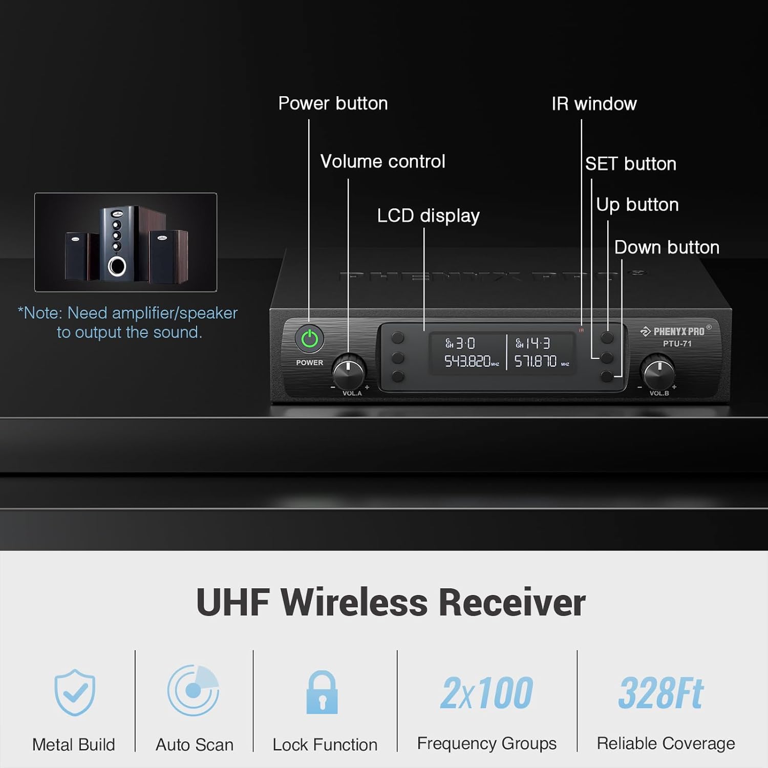 Phenyx Pro Dual UHF Wireless Microphone System,Auto-Scan Cordless Mic Set w/ 2x100 Frequencies, 2 Bodypacks & Headsets/Lapel Microphones for Speaking, Singing, Church, DJ (PTU-71-2B)