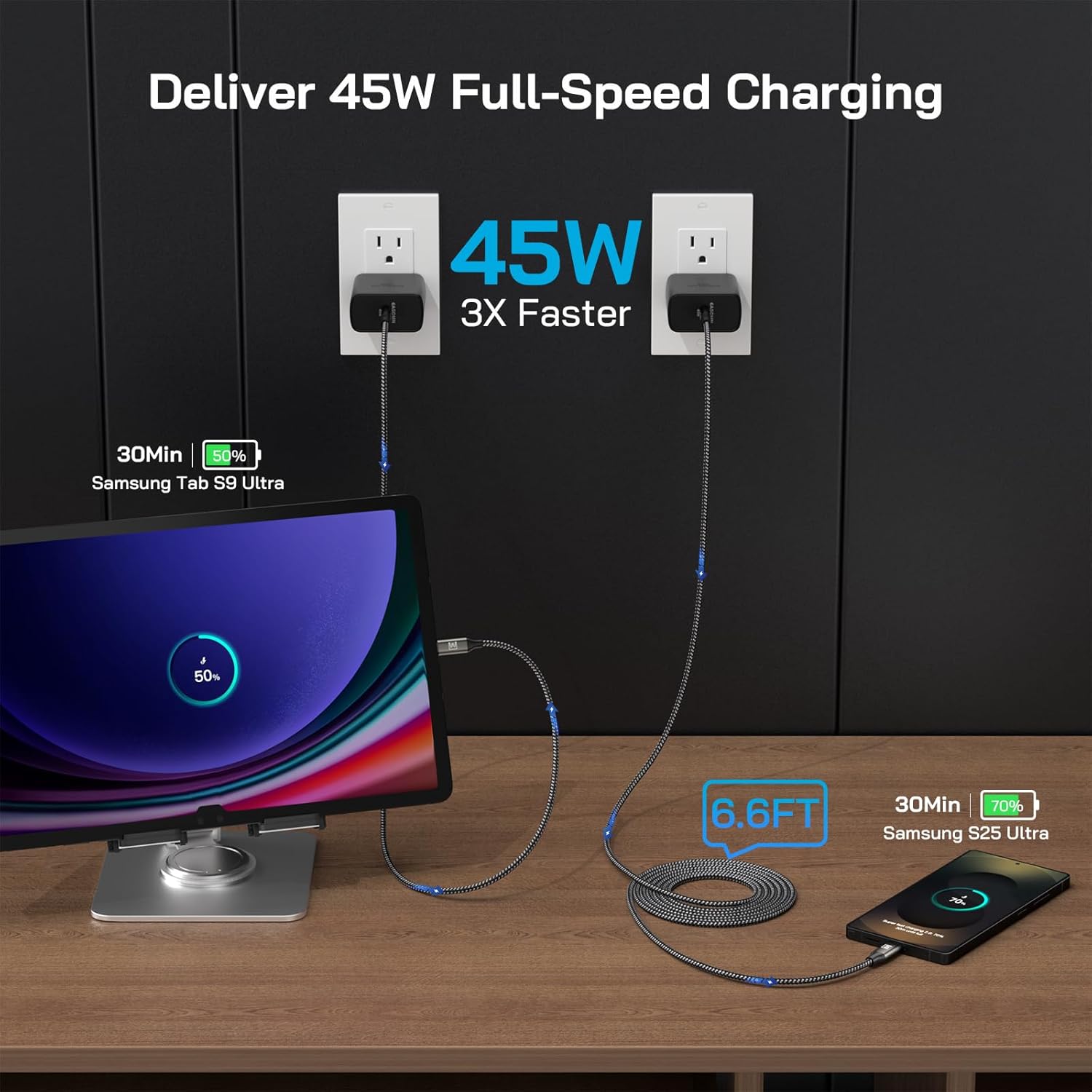 - 【45W Super Fast Charger 2.0 for Samsung】- 45W Type-C Fast Charger for Samsung adopts latest PPS(Programmable Power Supply) fast charging technology to provide compatible Samsung devices with maximum power of 45W, charge up to 50% within 20mins for Samsung S25 Ultra(5000mAh), full charge only takes less than 1h; 3x faster than 15W old charger. (Compatible models: Galaxy S25 Ultra / S25+ / S24 Ultra / S24+ / S23 Ultra / S23+ / S22 Ultra / S22+ / S20 Ultra / Note 10 Plus /Tab S8 ultra)