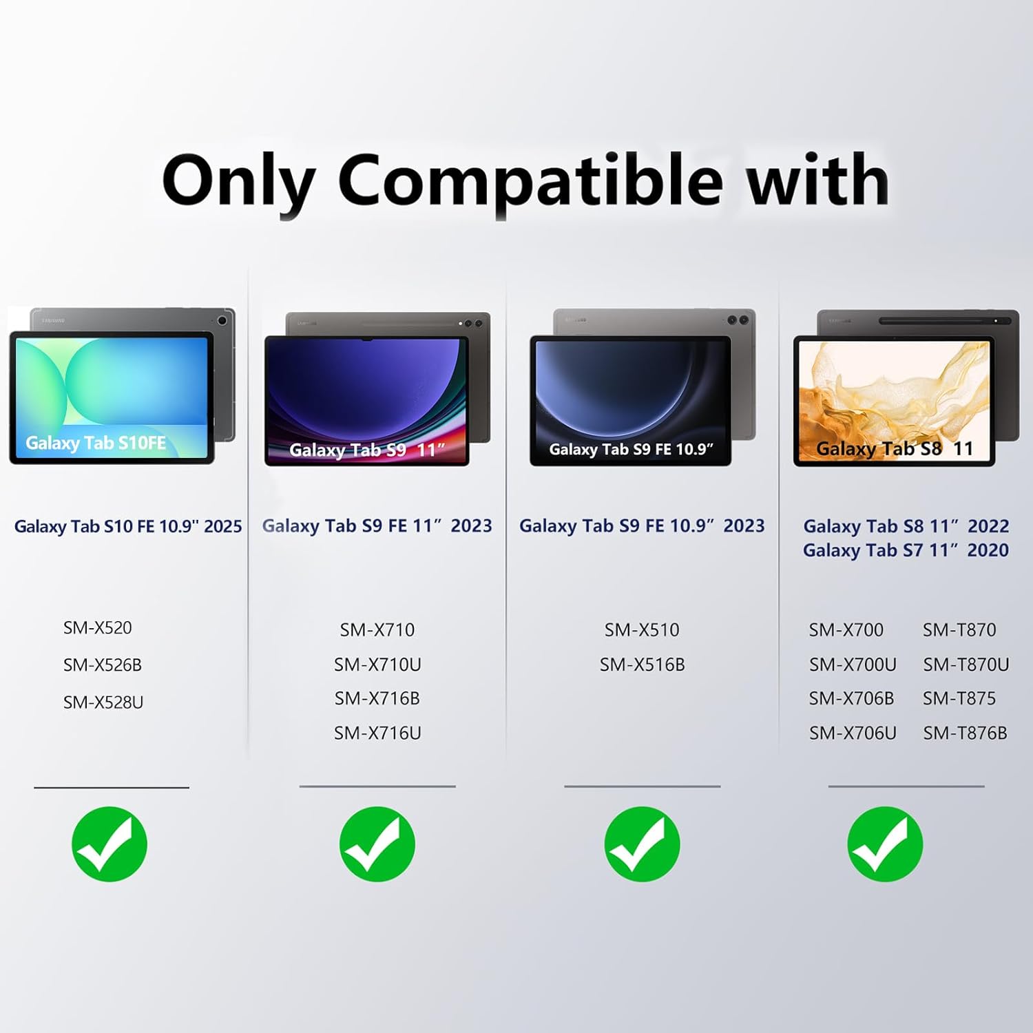 - âăCompatibilityăCompatible with Samsung Galaxy Tab S10 FE 5G 10.9 inch SM-X520 SM-X526B SM-X528U 2025.S9 FE 10.9" 2023, Model: SM-X510/X516B/X518U. Tab S9 11" 2023, Model:SM-X710/X716B/X718U. Tab S8 11" Model: SM-X700/SM-X706. Tab S7 11" Model: SM-T870/SM-T875/SM-T876. Please check the model before purchase. Tablet and S Pen NOT INCLUDED.
