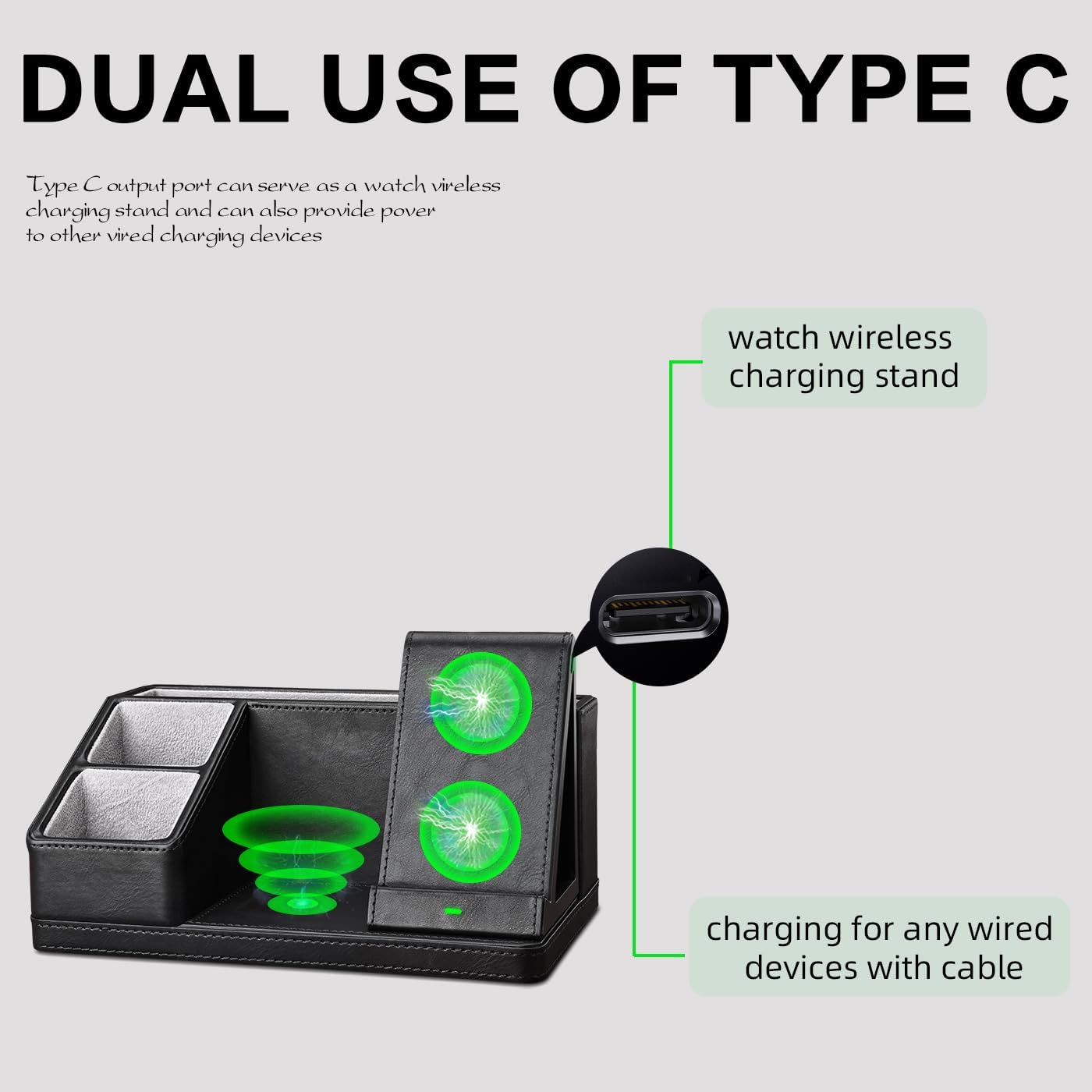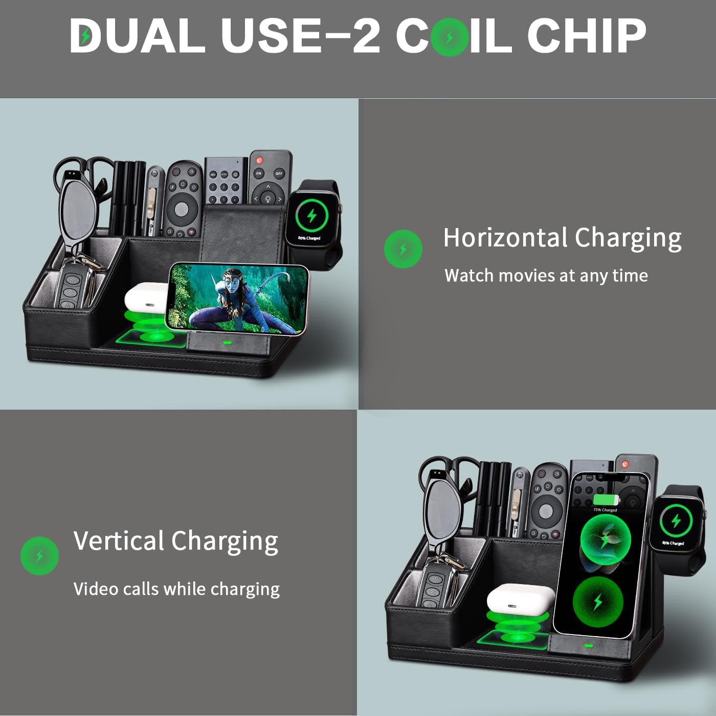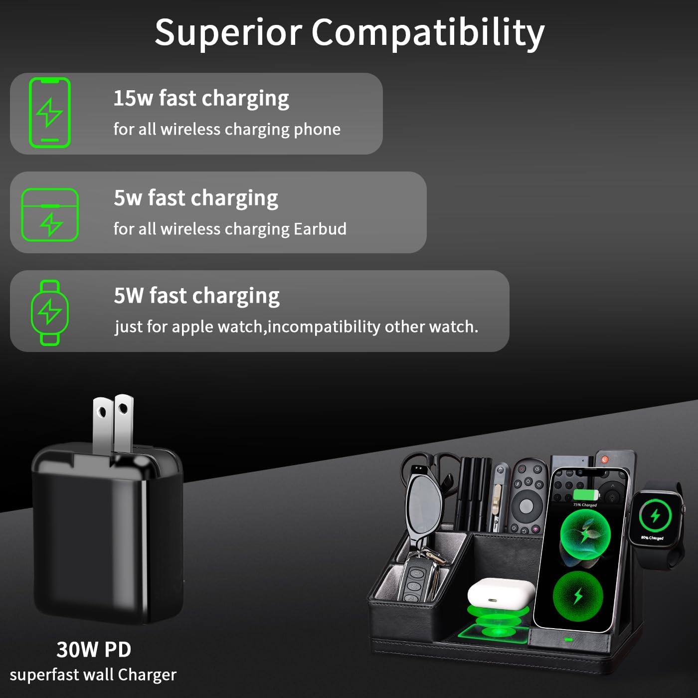 - Convenient Charging for Your Devices: Say goodbye to cluttered cords! Our organizer includes dedicated charging docks for your iPhone, Apple Watch, and AirPods, offering fast and wireless charging solutions. Simply place your devices on the designated charging areas for effortless charging.