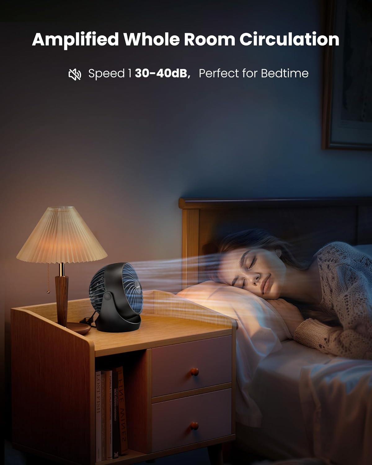 - Whisper-Quiet Cooling: With upgraded motor, the table fan has smoother airflow with minimal noise (30dB),max wind speed reaches 6.2 m/s; The cooling fan is powerful and quiet enough to give you a comfortable working and resting environment