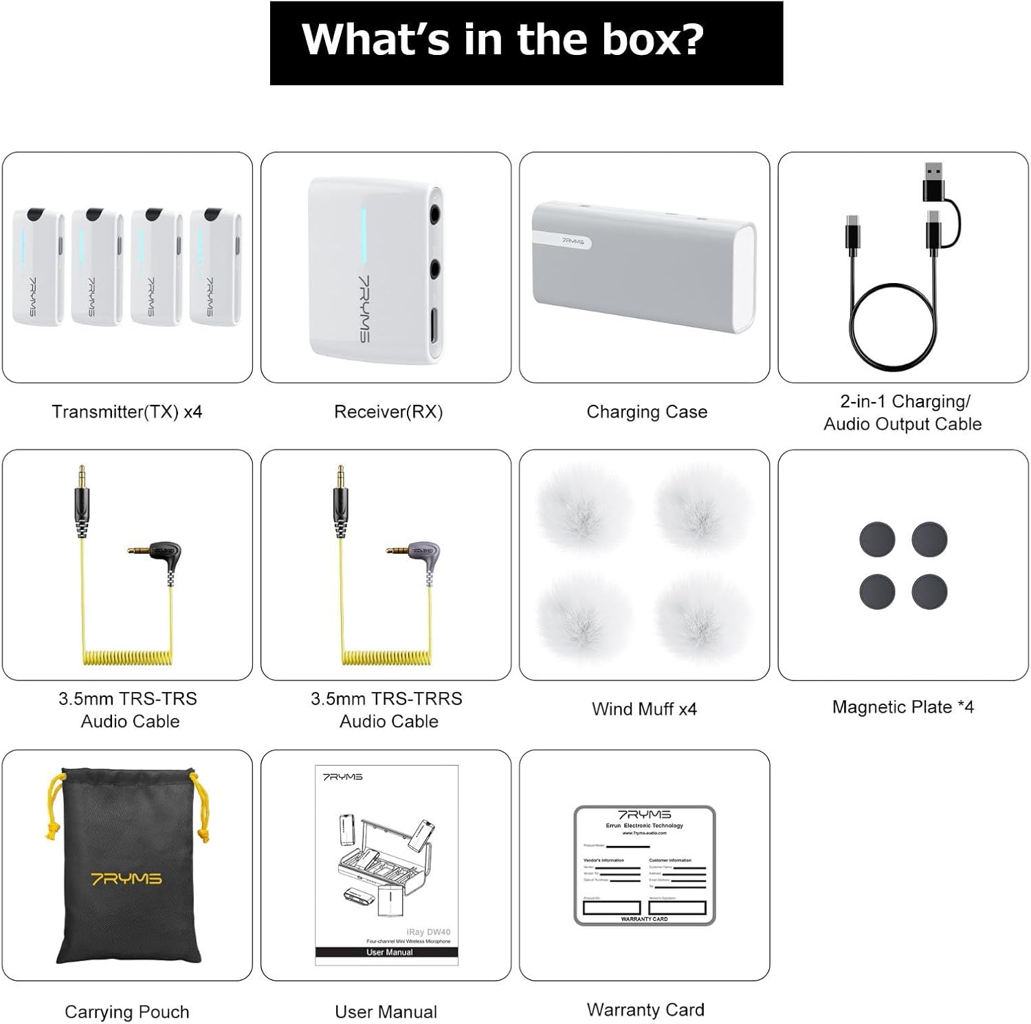 - Included Components : 4*Transmitter(TX) ;1*Receiver(RX);1*Charging Case; 1*2-in-1 Charging/Audio Output Cable;1*3.5mm TRS-TRS Audio Cable; 1*3.5mm TRS-TRRS Audio Cable; 4*Wind Muff ;4*Magnetic Plate; 1*Carrying Pouch;1*User Manual 4*Transmitter(TX) ;1*Receiver(RX);1*Charging Case; 1*2-in-1 Charging/Audio Output Cable;1*3.5mm TRS-TRS Audio Cable; 1*3.5mm TRS-TRRS Audio Cable; 4*Wind Muff ;4*M… See more