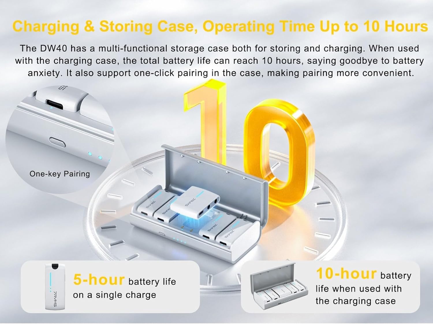 - [Charging and Storing Case, Operating Time Up to 10 Hours] The DW40 has a multi-functional storage case both for storing and charging. When used with the charging case, the total battery life can reach 10 hours, saying goodbye to battery anxiety. It also support one-click pairing in the case, making pairing more convenient