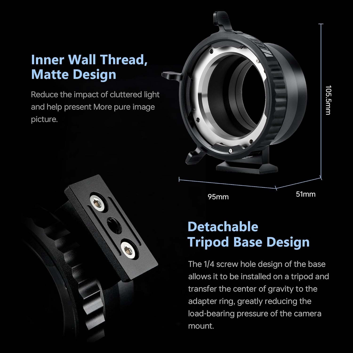 - 【Dust-proof design】The lens adapter is equipped with a rubber sealing ring to prevent dust and impurities from entering, keeping your equipment clean and protected. The Inner Thread Matting Design reduces the impact of cluttered light and helps present a purer image.