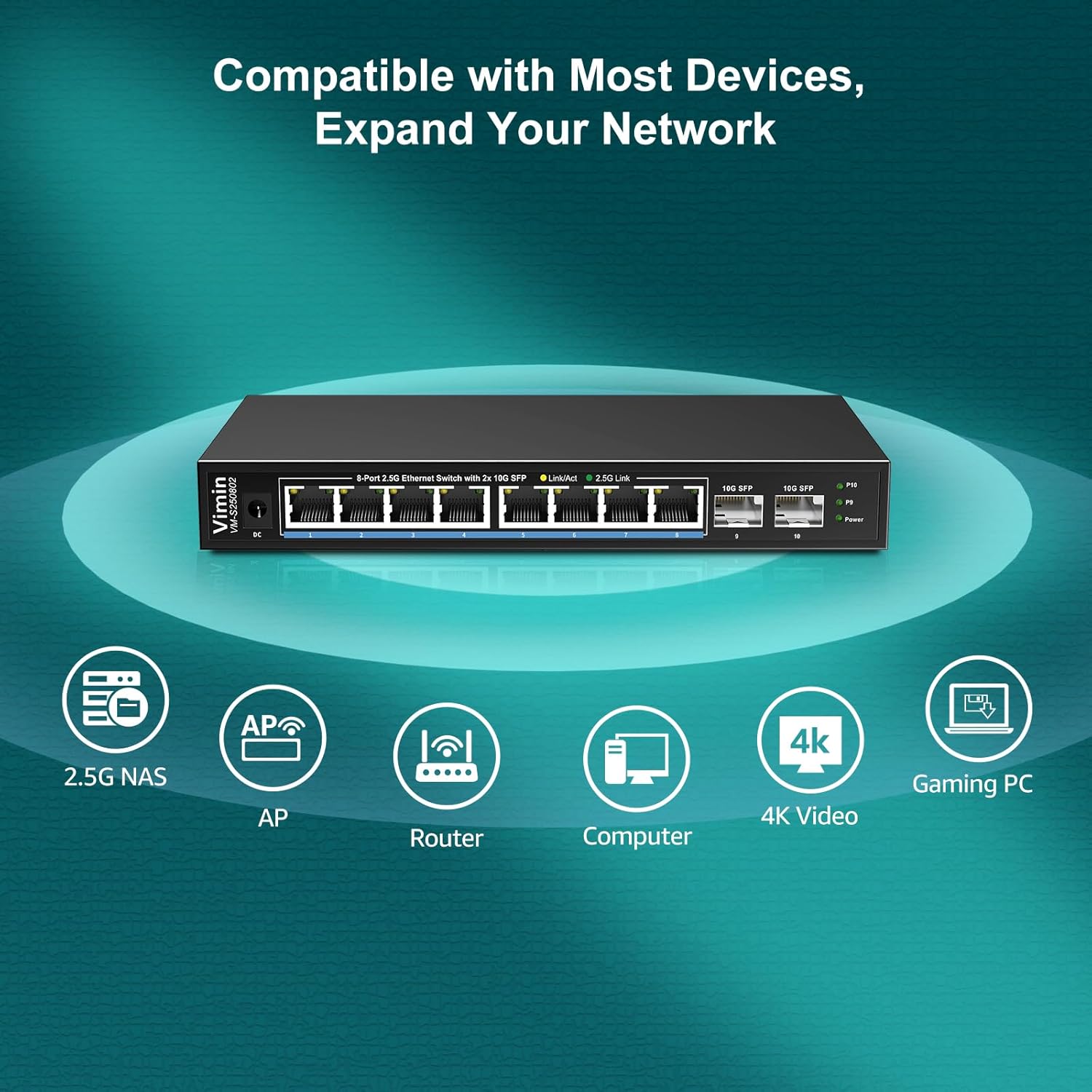 - π2.5G Network Connectivity: The VIMIN 10 ports 2.5g ethernet switch features 8x 2.5Gbps(8*10/100/1000/2500Mbps RJ45 ports) RJ45 ethernet ports and 2x 10Gbps SFP, The 2.5g switch providing high-speed and stable network connections to meet your needs.