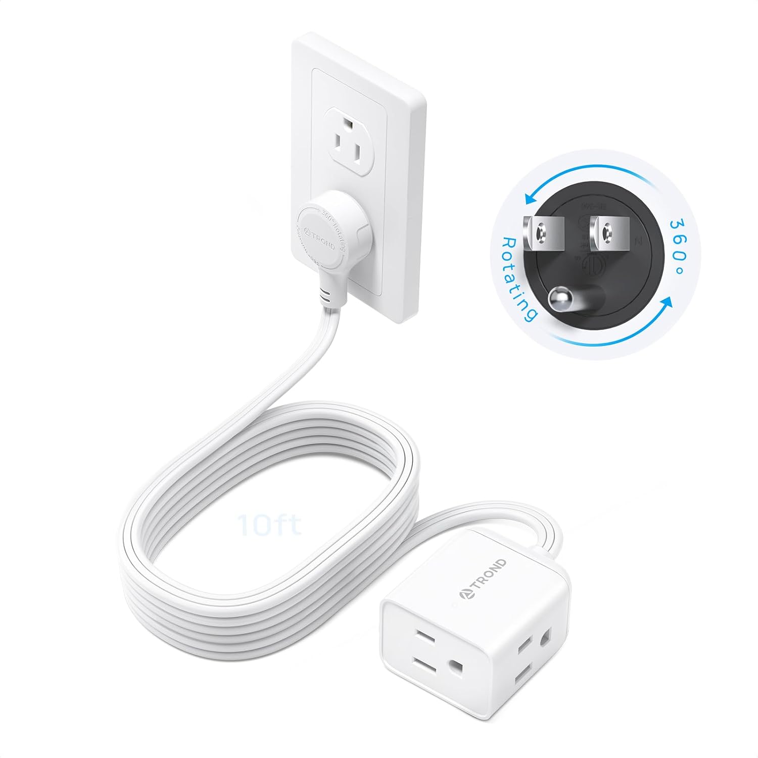 TROND Flat Extension Cord 10ft with 360° Rotating Plug, Low Profile Small Power Strip, 3 Prong Grounded Outlets Cube, 13A, SPT 16/3 AWG Cable, for Indoor Home Office Kitchen Cruise Essentials, White