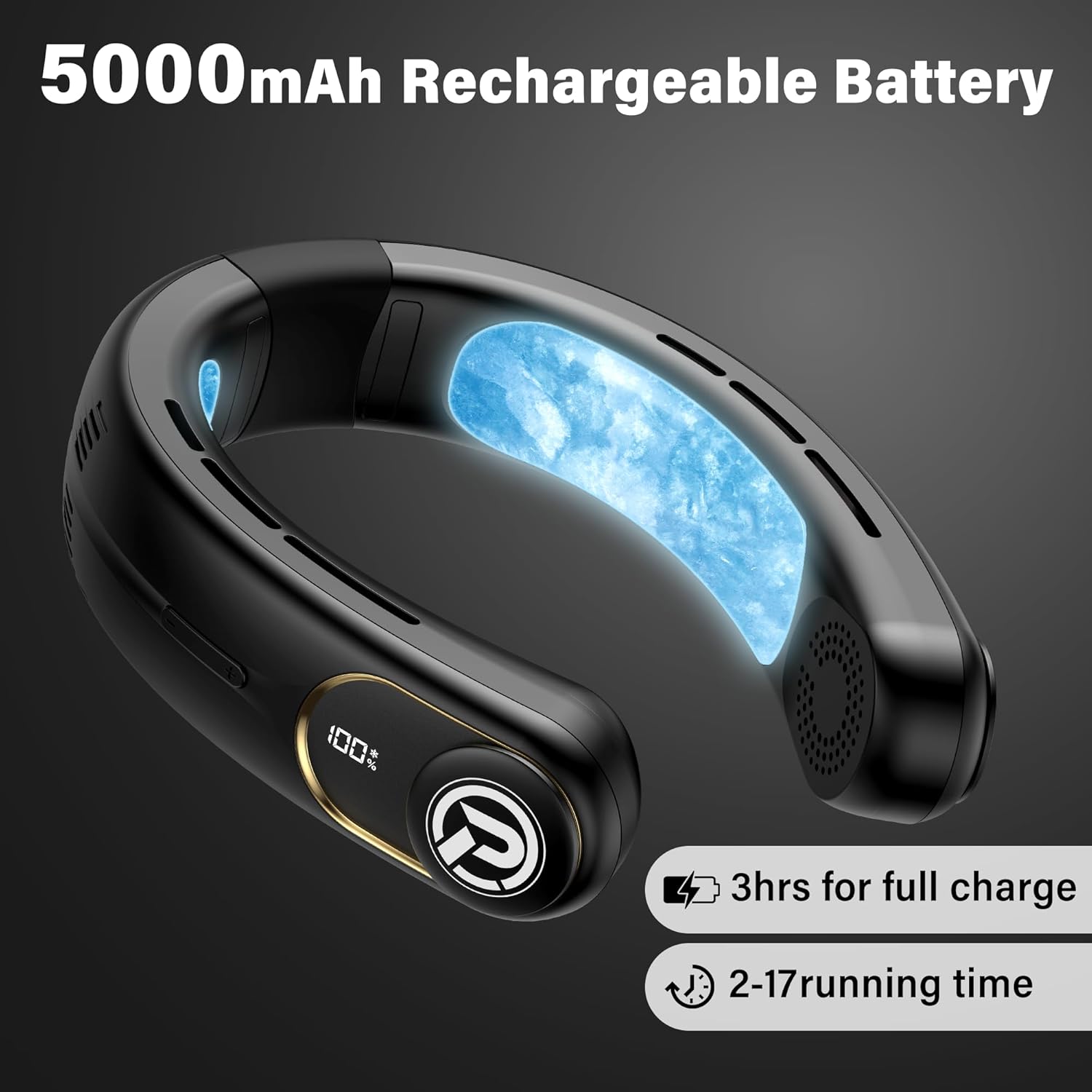 - ăLong-lasting Batteryă Powered by a 5000mAh battery, this rechargeable fan provides up to 17 hours in only the lowest speed setting. It can be fully charged in 3 hours via Type-C (included). An ideal wearable personal cooling device for hot summer outdoor use.