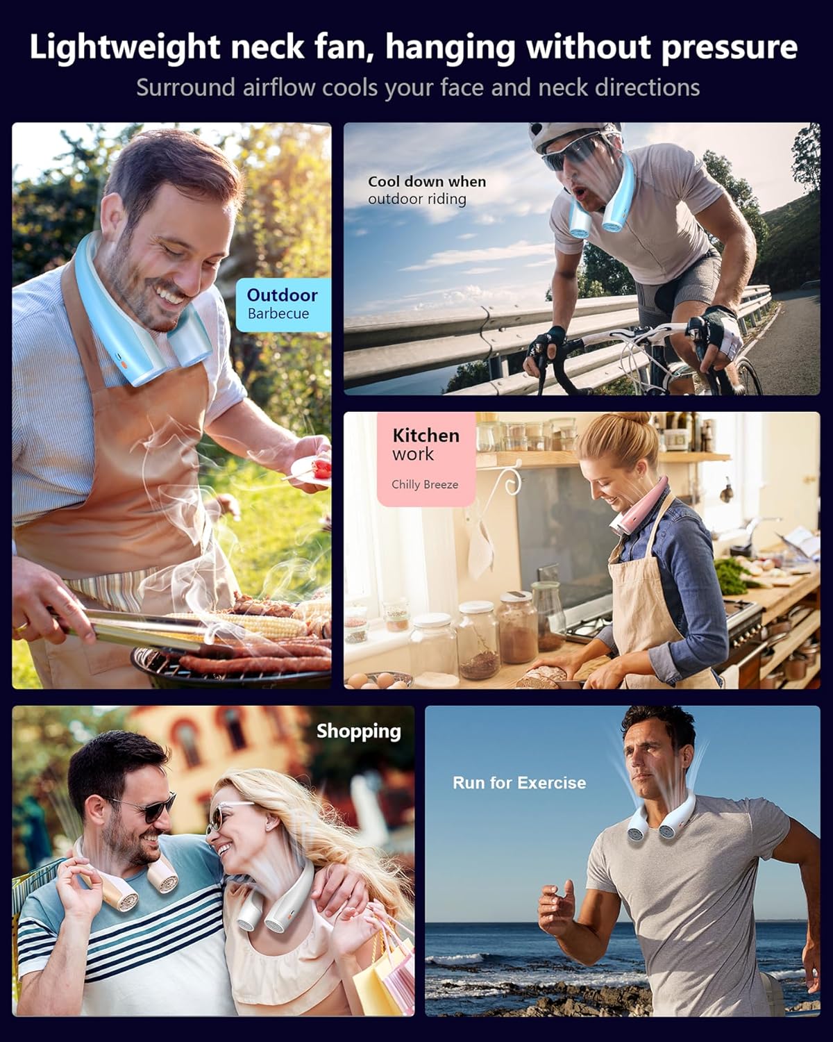 - Suitable for Multiple Scenarios - The personal neck fan helps keep you cool during various outdoor activities like gardening, traveling, hiking, biking, and concerts. It is also suitable for all indoor scenarios, ensuring you stay cool whether you're working, exercising, cooking, or enduring hot environments.