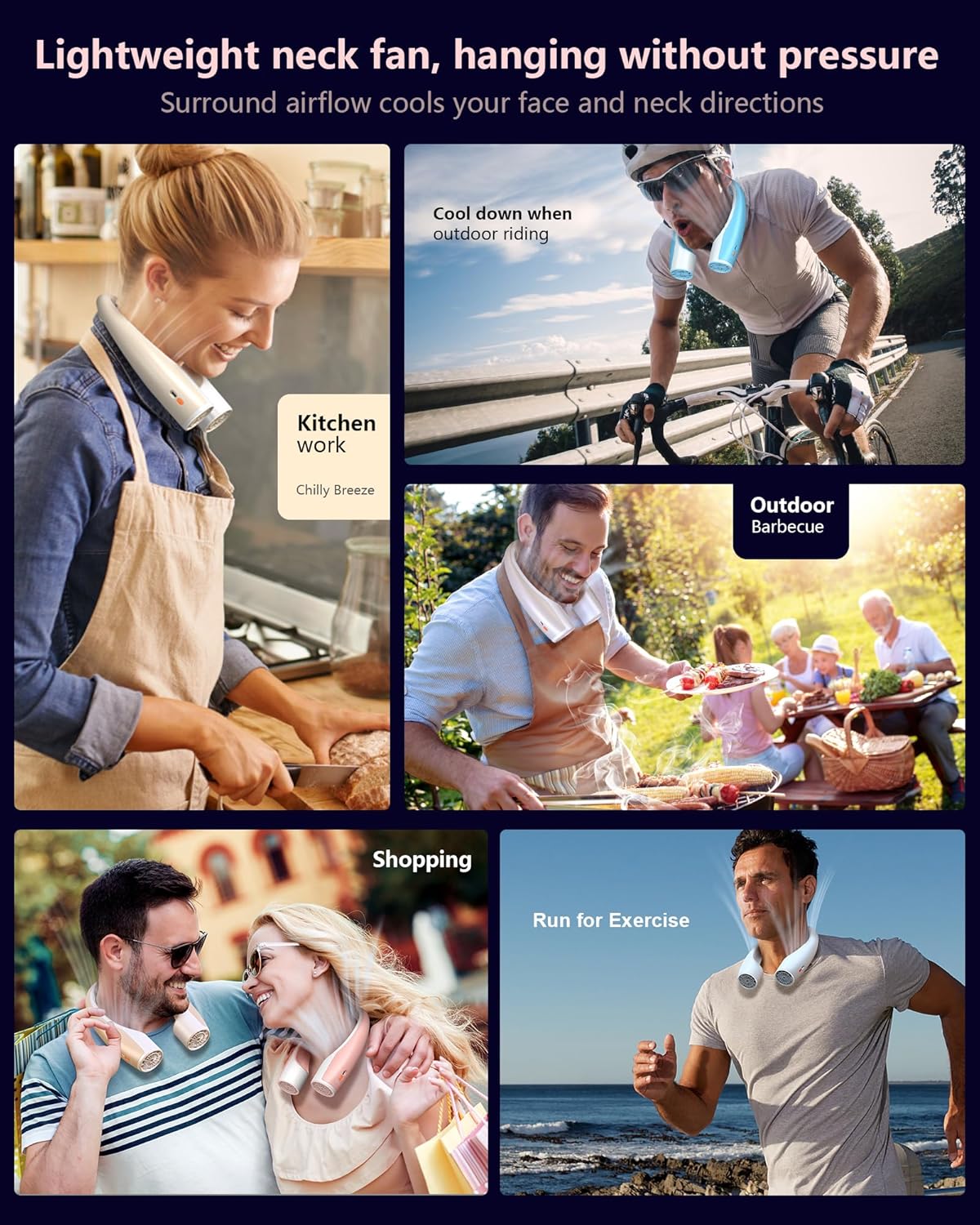 - Suitable for Multiple Scenarios - The personal neck fan helps keep you cool during various outdoor activities like gardening, traveling, hiking, biking, and concerts. It is also suitable for all indoor scenarios, ensuring you stay cool whether you're working, exercising, cooking, or enduring hot environments.
