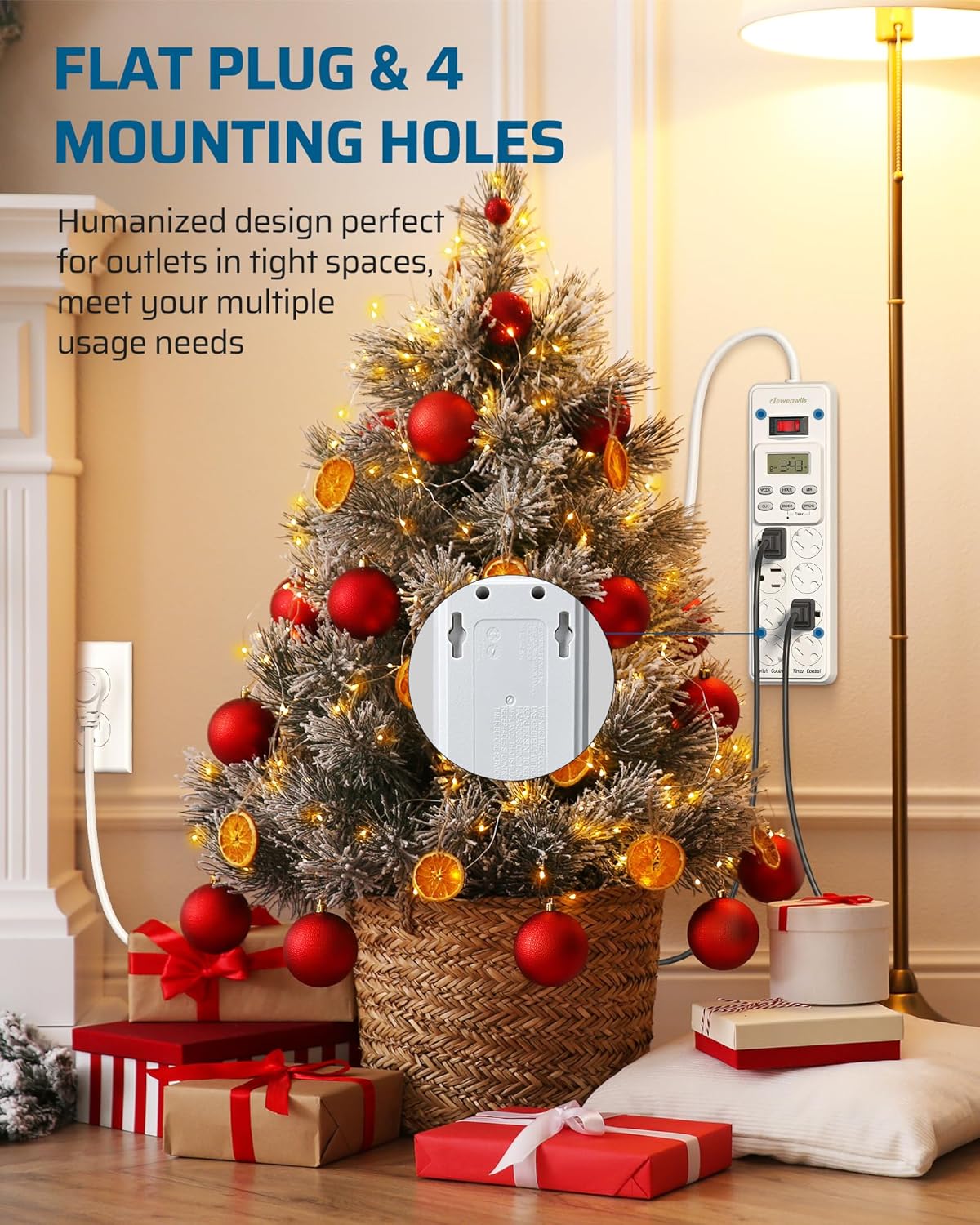 - [User-Friendly Design] The flat plug fits behind furniture, while 4 rear mounting holes make it easy to hang on the wall; with a 6ft cord for flexible use and rotating outlet covers to block dust and prevent accidents, this digital timer power strip ensures convenience and safety