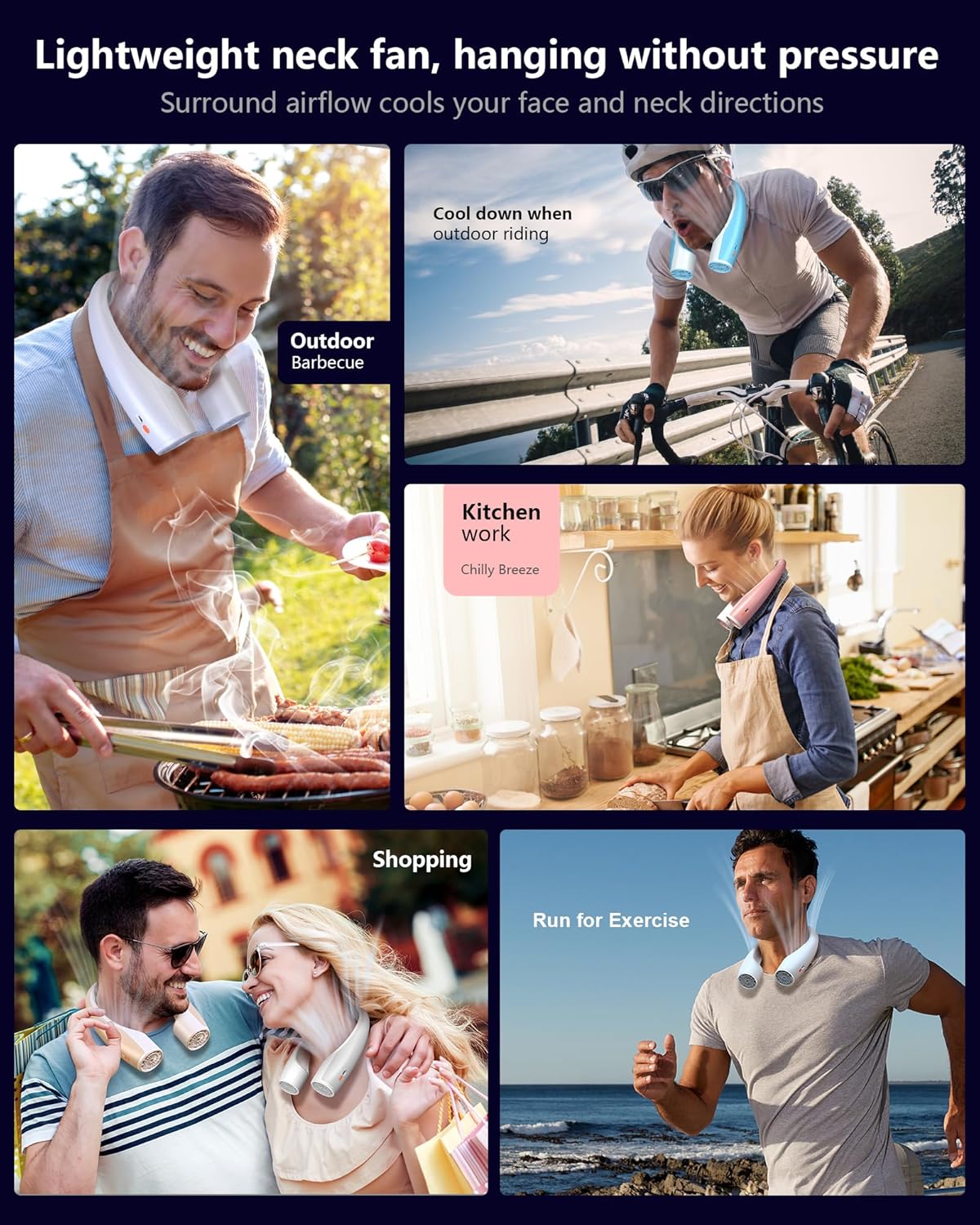 - Suitable for Multiple Scenarios - The personal neck fan helps keep you cool during various outdoor activities like gardening, traveling, hiking, biking, and concerts. It is also suitable for all indoor scenarios, ensuring you stay cool whether you're working, exercising, cooking, or enduring hot environments.