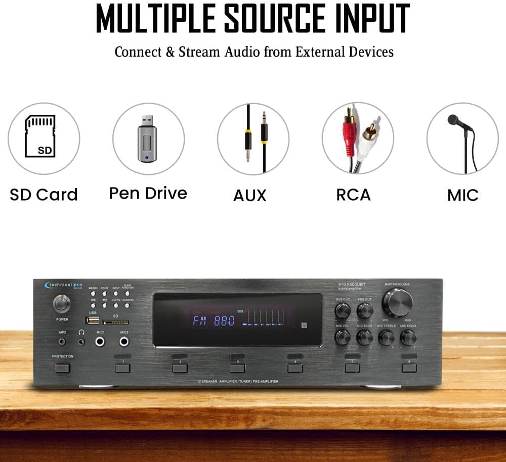 - HYBRID AMPLIFIER: Transform your space with our six-zone, 8-speakers capacity hybrid amplifier system, delivering 6000 watts of power. Customize your sound management across different sections with Bluetooth v2.0 connectivity, USB and SD card inputs, and iPod compatibility. Ideal for home, bar, or nightclub use, this amplifier comes with a wireless remote for convenience.