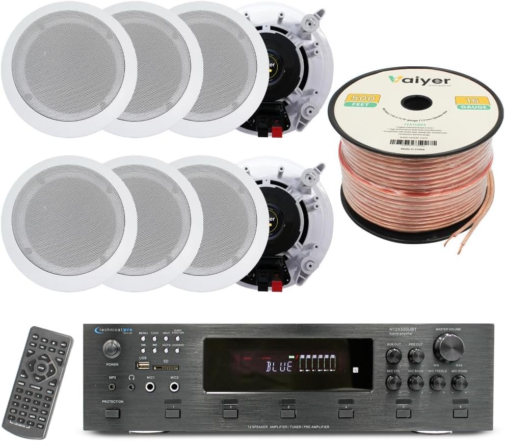 Vaiyer Home Audio System Kit, 6-Channel 6000 Watts Bluetooth Amplifier with 6.5" 8 QTY of 200 W Each in-Wall in-Ceiling Speakers & 16AWG 500 ft. Speaker Wire Perfect for Home, Office, Restaurants, Bar