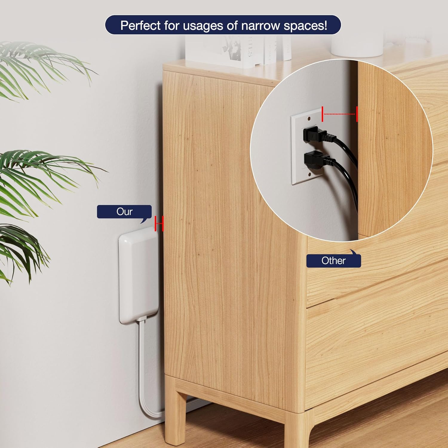 - Great for small spaces flat plug power strip,features with ultra thin flat grounded 3 prong plug,flat and durable power cord,offers 3 standard outlets to meet to all your power requirements. Ideal for various home arrow areas like kitchens,bathrooms,bedrooms and living rooms;