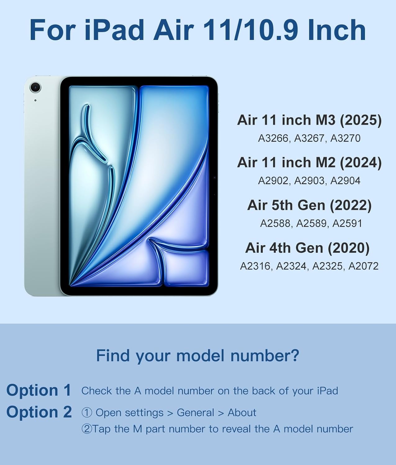 - â¤ăPerfect CompatibilityăSpecially designed Compatible with iPad Air 11-inch (M3) 2025 (Model Number: A3266/A3267/A3270), for iPad Air 11-inch (M2) 2024 (A2902/AA2903/A2904), for Air 5th Generation 2022 (A2588/A2589/A2591), for Air 4th Generation 2020 (A2316/A2324/A2325/A2072), this keyboard case offers precise cutouts for all ports, buttons, and cameras, seamless access to all features without removing it. Please find the No. "AXXXX" of your tablet before order(Open settings > General > About, Tap the M part number to reveal the A model number)