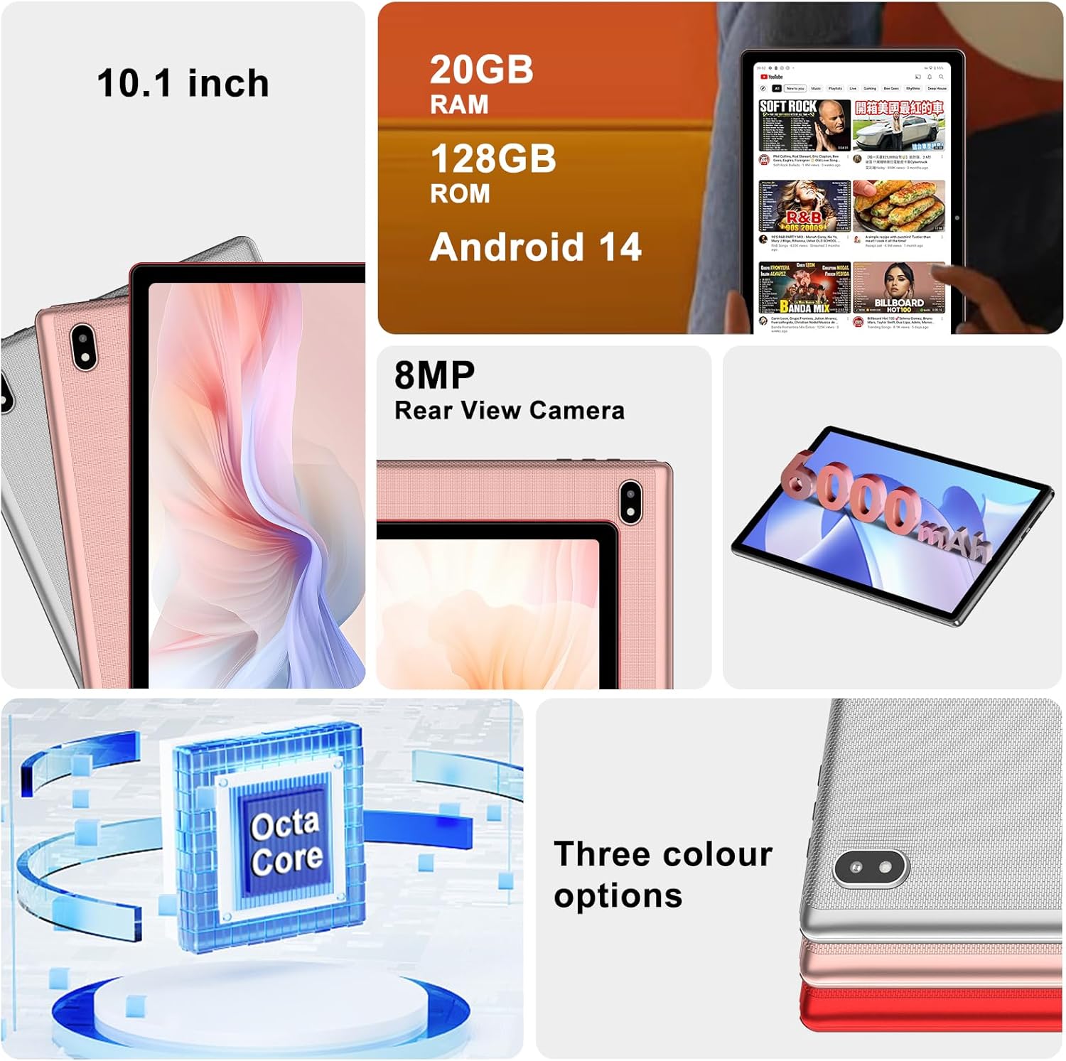 - 【20GB (6+14) RAM + 128GB ROM + TF 1TB】Android 14 tablet comes with 20GB (6GB + 14GB virtual) of RAM and 128GB of internal storage, easily handling large applications and multitasking. Expandable storage up to 1TB is available via microSD/TF card (SIM card not supported), eliminating storage concerns. Powered by an Allwinner octa-core processor (up to 1.8GHz), it delivers powerful performance and smooth operation for a wide range of entertainment needs, including videos, music, e-books, online courses, networking, and games.