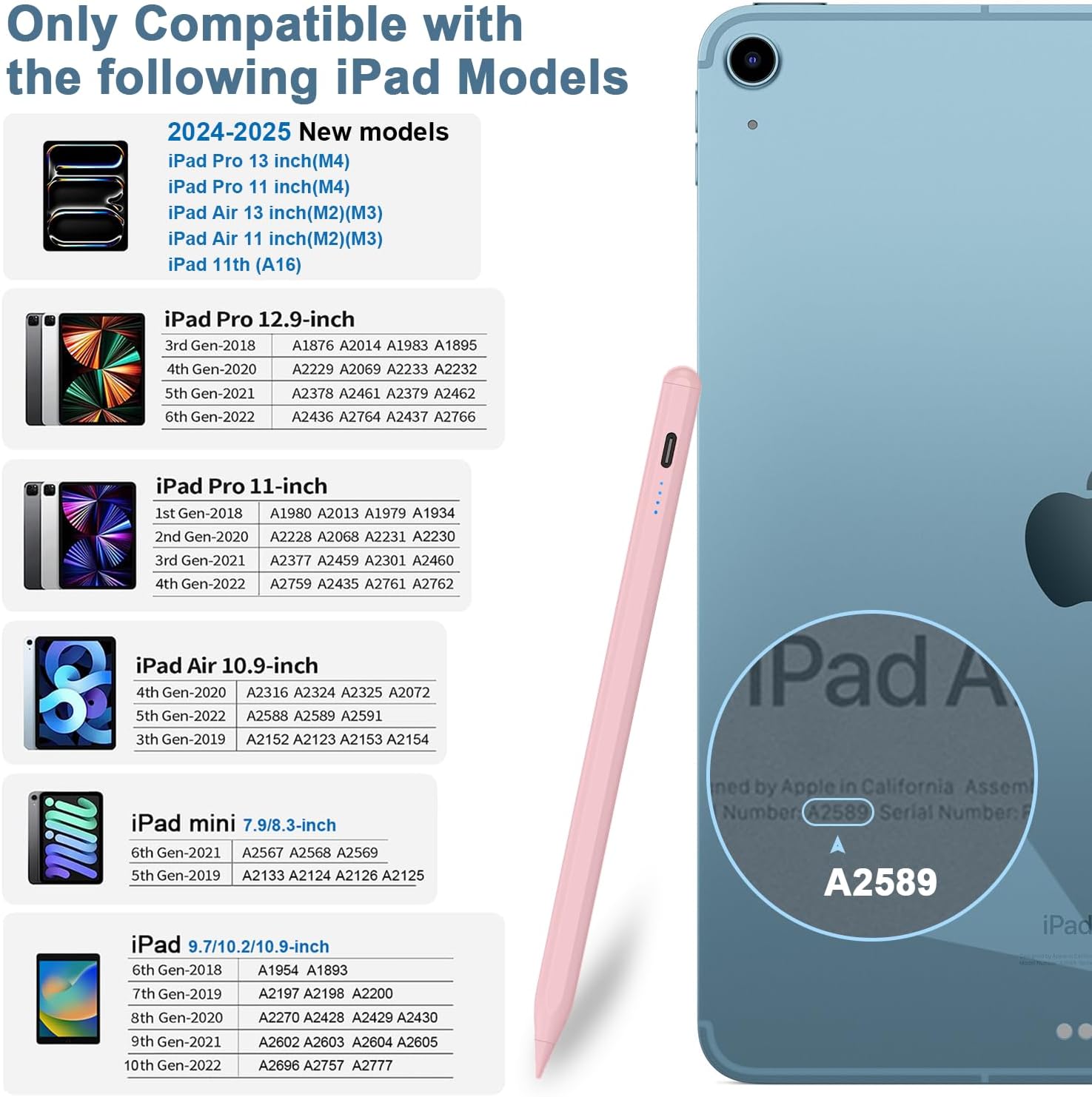- 【Compatible with iPad only】 This iPad Pencil only supports the iPad (2018-2025) series, iPad Pen is compatible with iPad 11(A16)/10/9/8/7/6, iPad Air 3/4/5/M2/M3, iPad Pro 11-inch 1/2/3/4/M4, iPad Pro 12.9-inch 3/4/5, iPad Pro 13" (M4), iPad Mini 5/6 Gen. 【Note】 This iPad pen is Not compatible with iPad models prior to 2018, Not compatible with iphones, Not compatible with Android or Windows phones and tablets. Please confirm model compatibility before placing an order