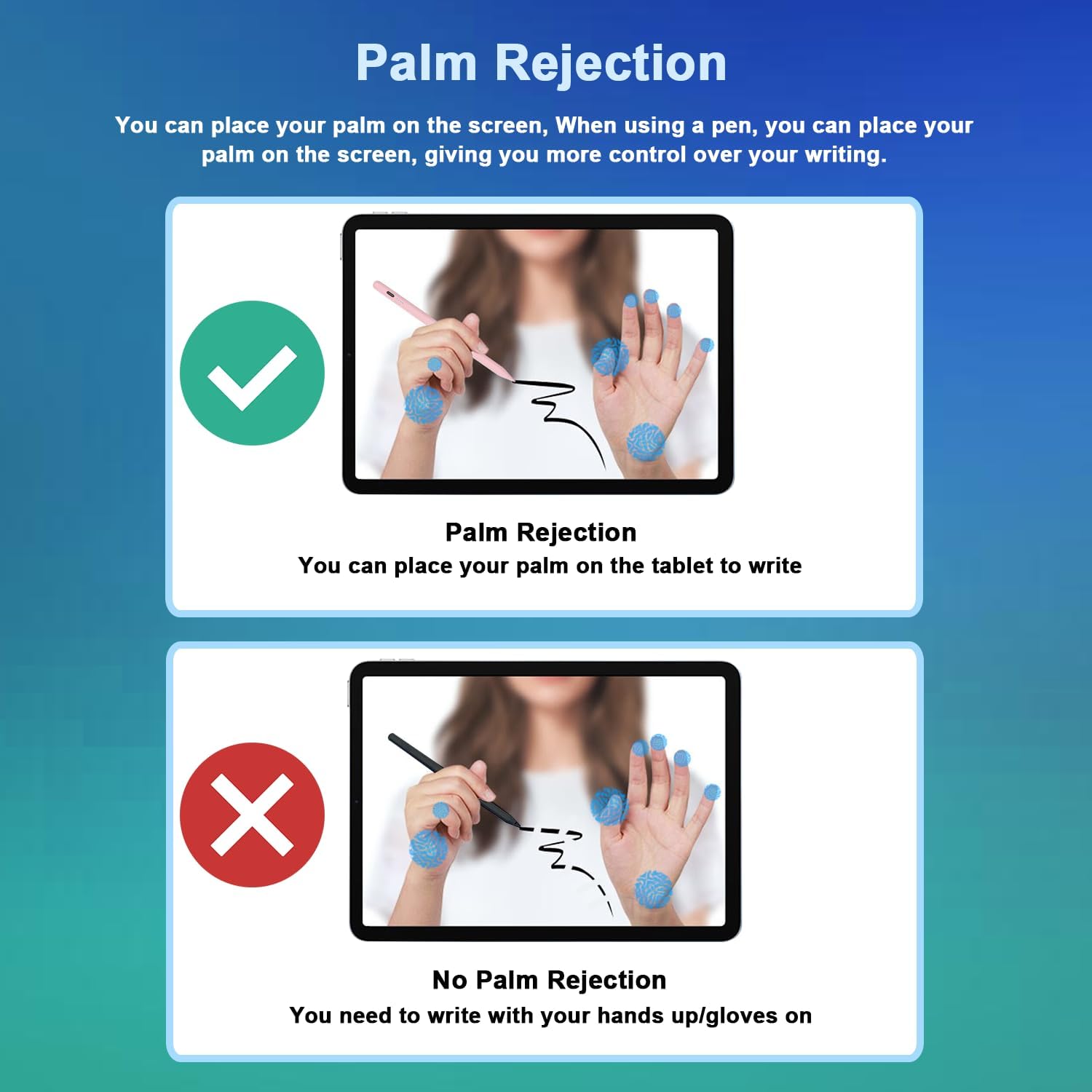 - 【Power display/Palm Rejection】 The active stylus pen for iPad has 4 power indicators, each representing 25% power, so you can watch your battery consumption progress in real time so you can recharge before important work begins. This iPad pencil has palm rejection. You don't have to worry about putting your hand on the Tablet to prevent the iPad Tablet Pen from writing, and you don't have to wear a false tentacle cover, which effectively prevents the palm from interfering with the stylus, so you can write and draw more freely