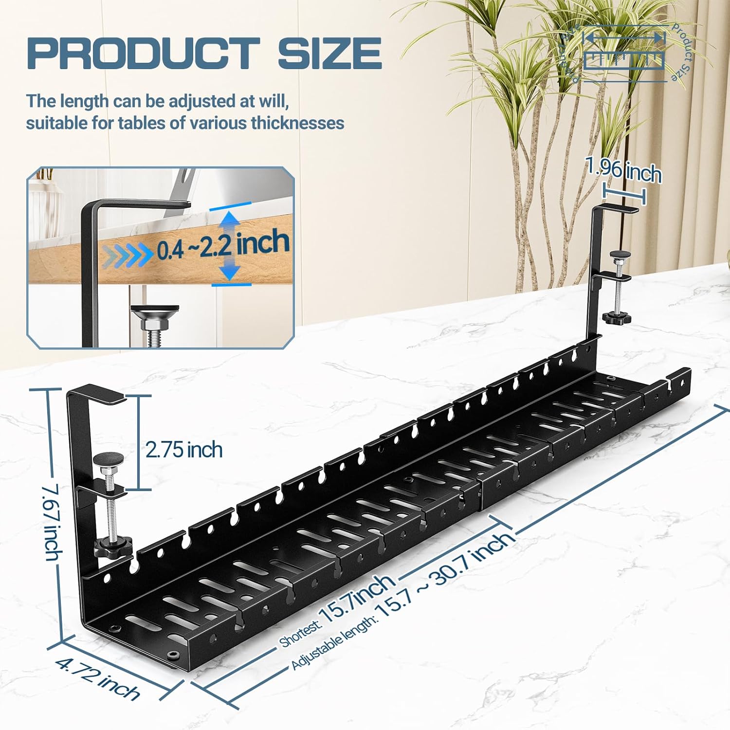 - 【Space-saving Design】: Keep your desktop clutter-free with this adjustable, no-drill, easy-to-install and remove under desk cable management tray that holds multiple power strips and chargers. The C-clamps with adhesive anti-friction pads hold it in place without damaging the desk.