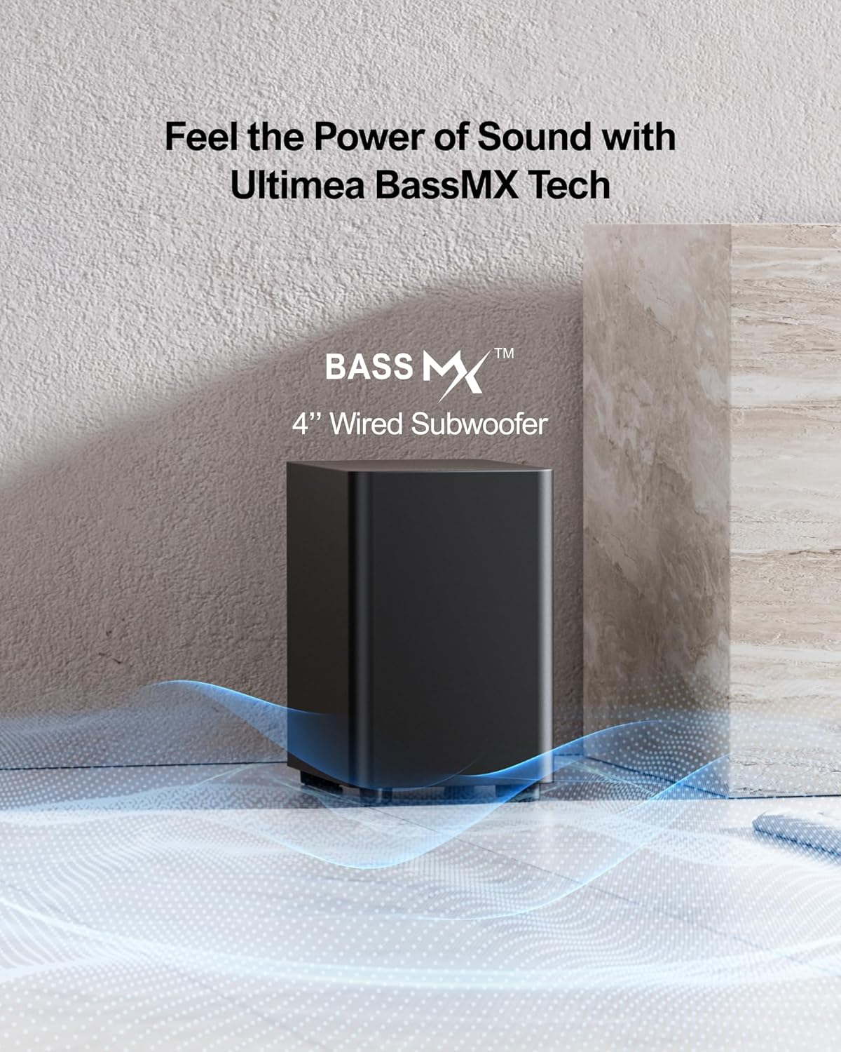 - 4" Wired Subwoofer with BassMX Technology: The Ultimea tv sound bar comes with a 4" wired subwoofer featuring BassMX technology to boost low-frequency sound. Its specially engineered design produces rich, deep bass, intensifying action scenes and explosions with impressive power.