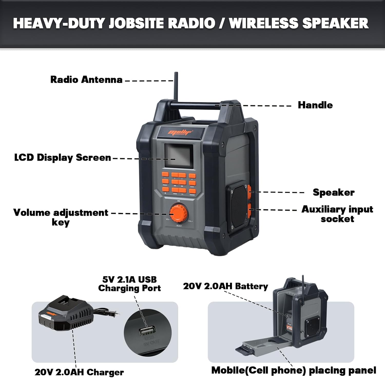 - 3 Power Options: The radio / speaker compatible with Dewalt 20v max batteries. Includes a Mellif 20V 2.0Ah battery & charger kit and an 18V/1.3A charge adapter for flexibility use. You can turn it to a power supply with a 5V 2.1A USB charging port