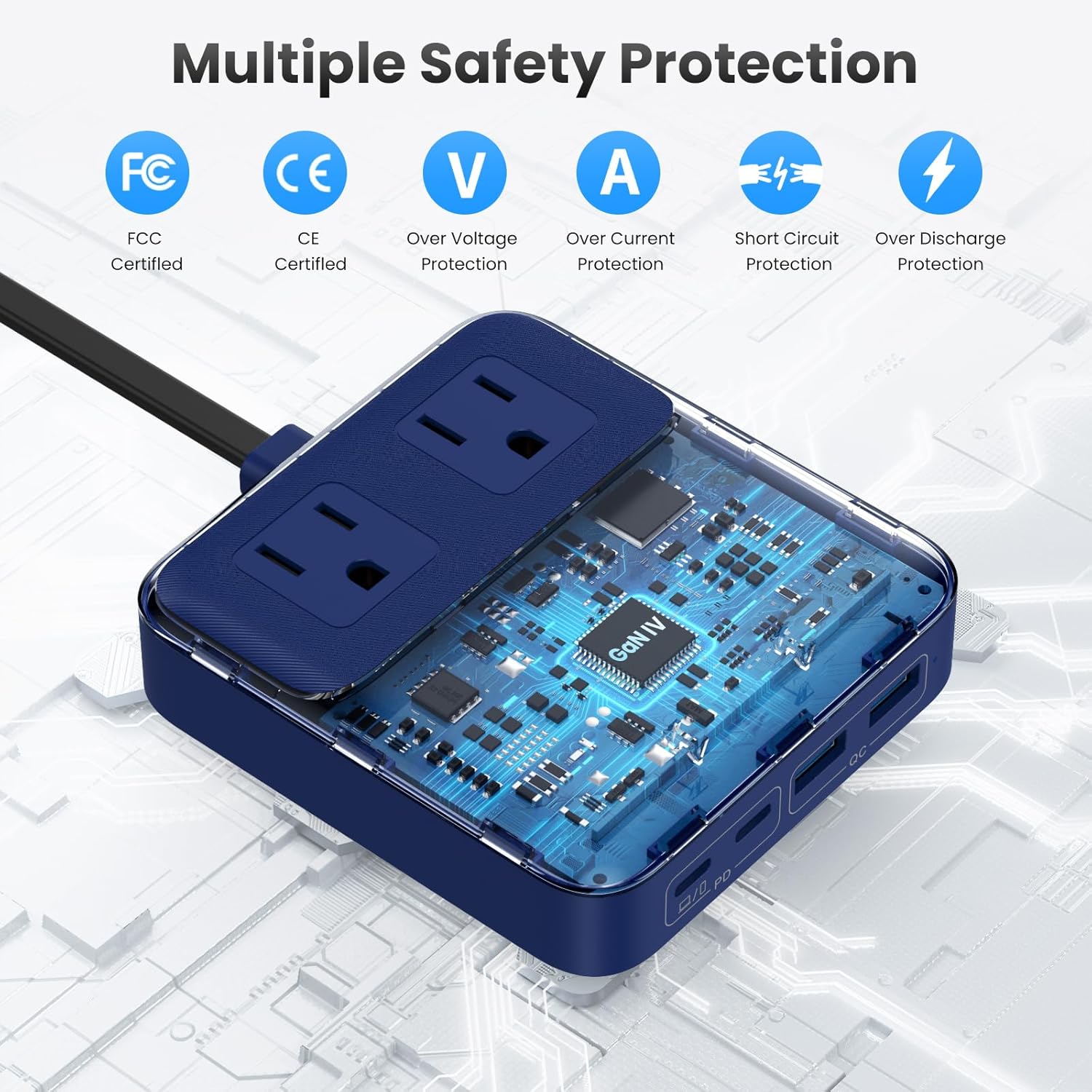 USB C Charger Block,135W GaN IV Fast Charging Station Hub,6-in-1 USB C Power Strip with Flat Plug and 5ft Cord,2 AC,2 USB A,2 USB C,PD 65W Laptop Charger for MacBook Air/Pro,iPhone16/15,S24-Dark Blue
