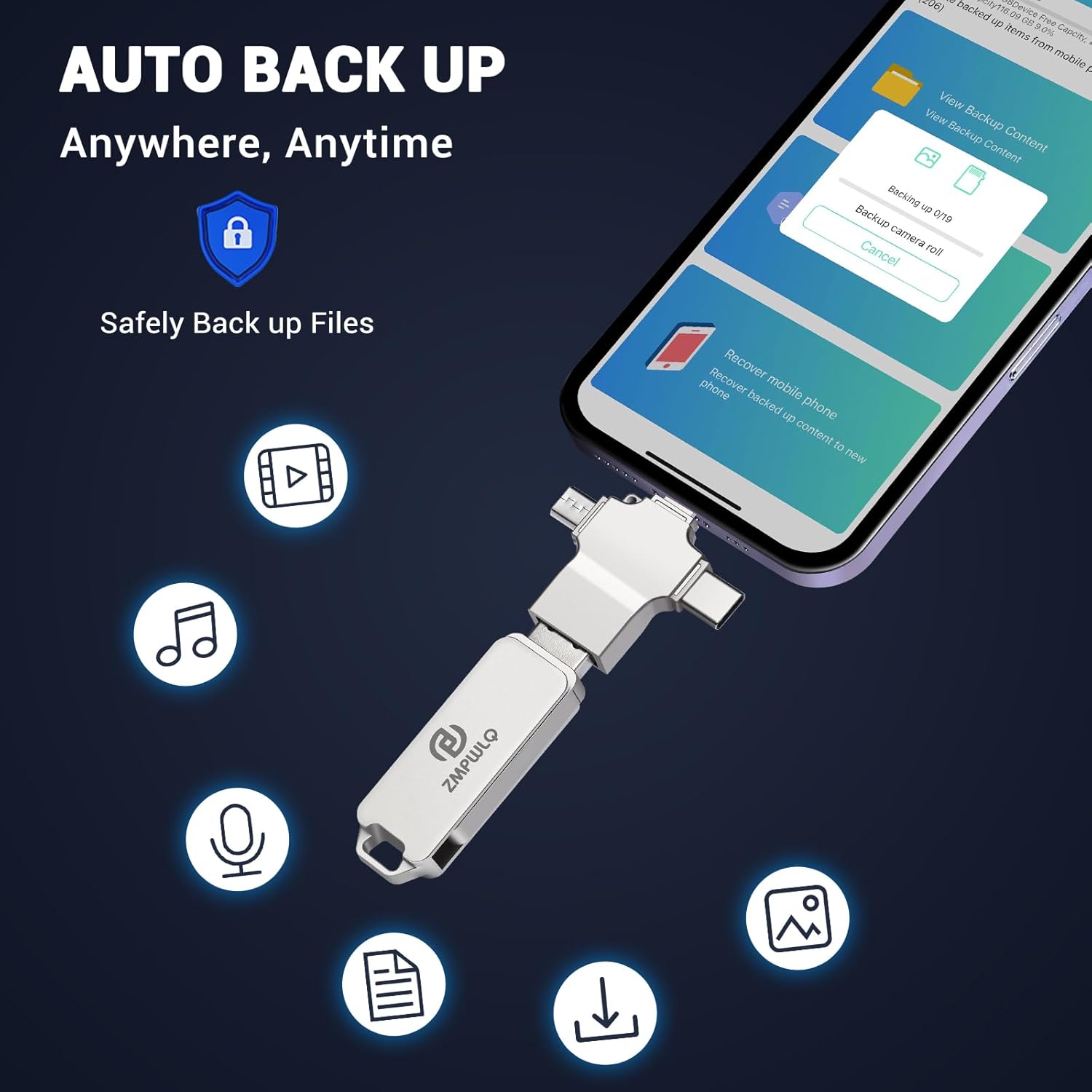- Perfectly compatible with multiple devices:PL ZMPWLQ 4-in-1 photo backup stick has Lightning, USB-C, Micro USB and USB 3.0 interfaces. It seamlessly connects with iPhones, iPads, most Android phones, tablets, PCs and Macs. Makes photo backup between different devices convenient. No interface mismatch worries. Smooth and efficient.