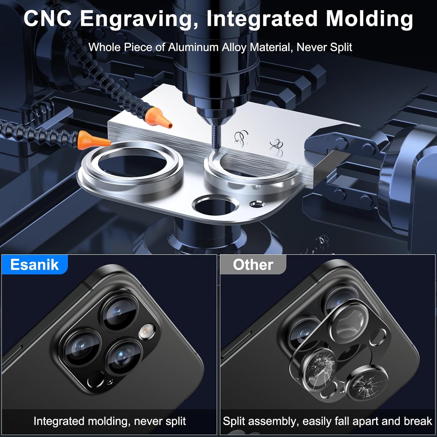 - 【CNC Engraving & Integrated Molding】 Esanik 2024 Upgrade Version iPhone 16 pro max / iPhone 16 Pro Cam Cover is precisely carved from whole piece of high-quality aluminum alloy, firm and long lasting. Bid farewell to the split and falling apart issues resulting from the conventional split assembly process.
