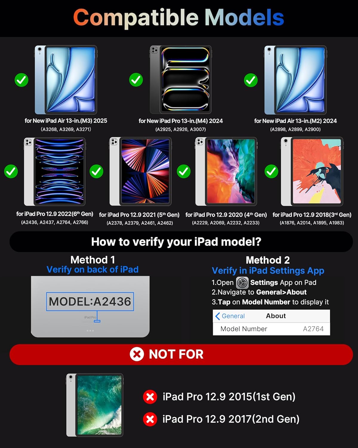 - Compatibility: Compatible with New iPad Air 13-inch (M3, 2025), iPad Air 13-inch(M2, 2024), iPad Pro 13-inch (M4, 2024), iPad Pro 12.9 (3/4/5/6th Gen). Models include A2925, A2926, A3007, A2898, A2899, A2900, A2436, A2437, A2764, A2766, A2378, A2379, A2461 and more.