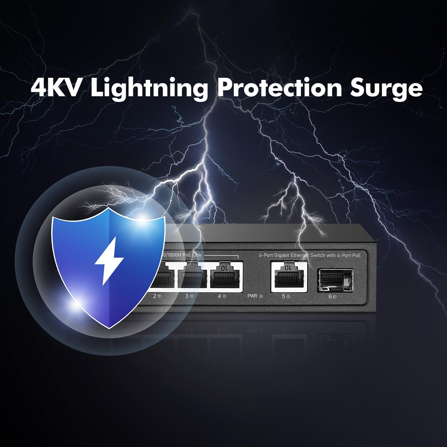 - 【6 Gigabit Ports】Includes 4 Gigabit POE, 1 Gigabit Uplink and 1 SFP Port, all ports support 10/100/1000Mbps auto-adpative; switching capacity is 12Gbps, supports full line rate forwarding of all ports. SFP Slot supports single-mode and multi-mode optical module, which can transmit longer distances through optical fibers.